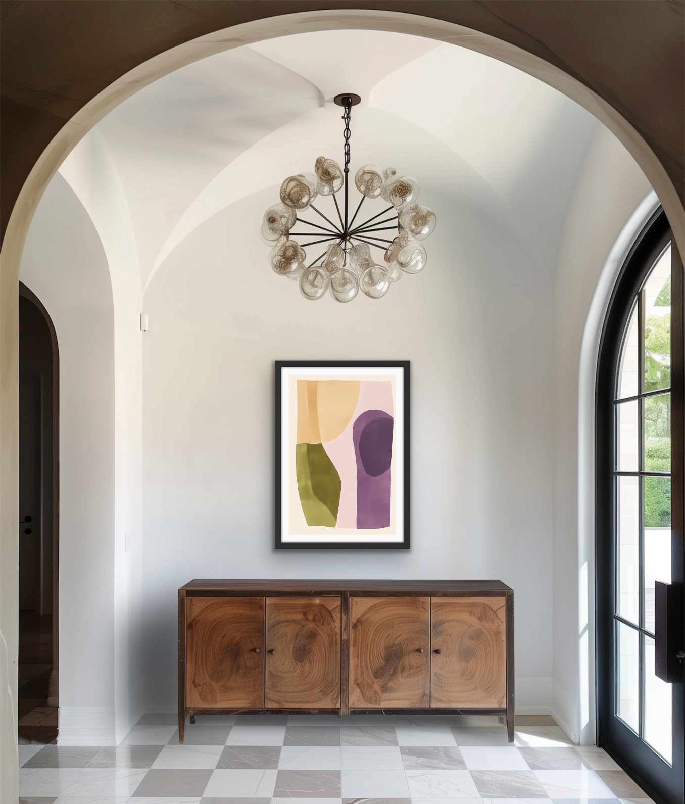Enjoy our abstract layered artwork with purple, green & yellow along with many different print options.