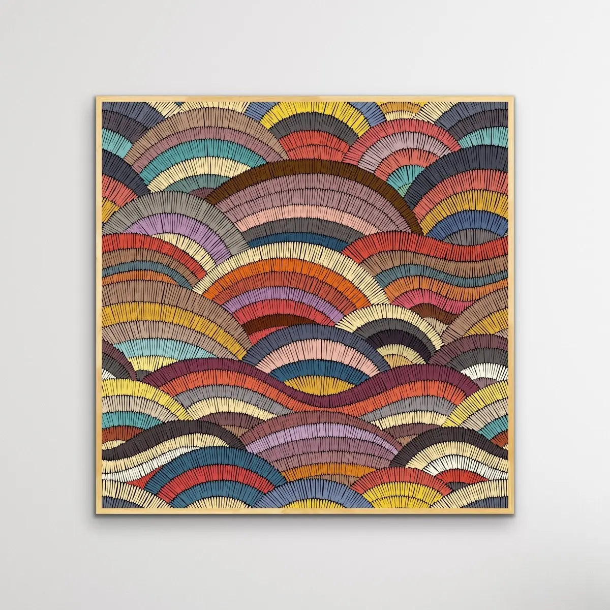 This beautiful print is earthy and on trend. Featuring small, colourful lines that look almost like embroidery stitches, this unique and organic print series is perfect for contemporary or boho home styling.