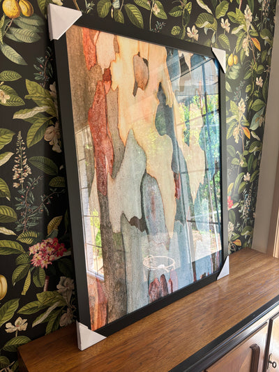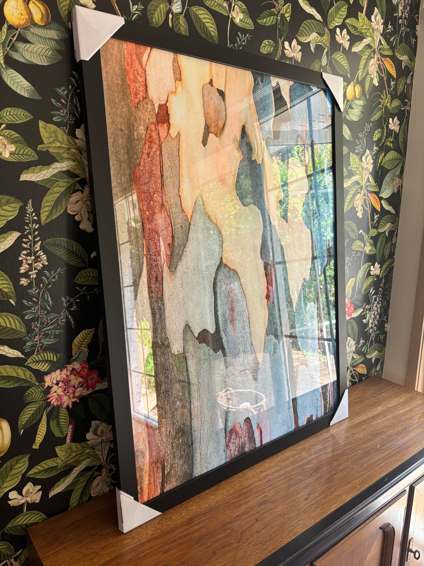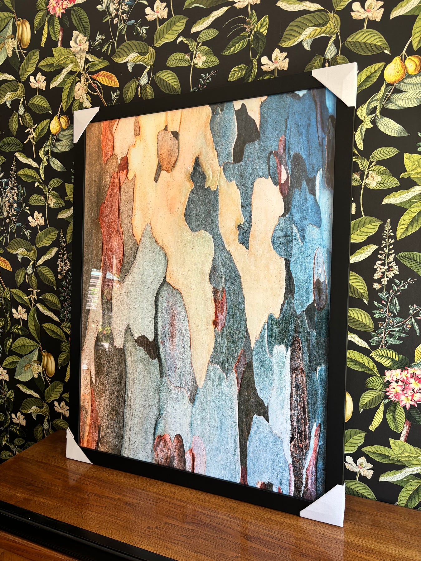 This artwork is Bark In Blue Tones, measuring 75x100cm, in a black frame. It's an art print with a plexiglass front. There is no white border.