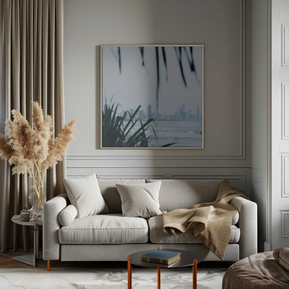 Misty Ocean Cityscape - Square Stretched Canvas, Poster or Fine Art Print by Angela Hawkey