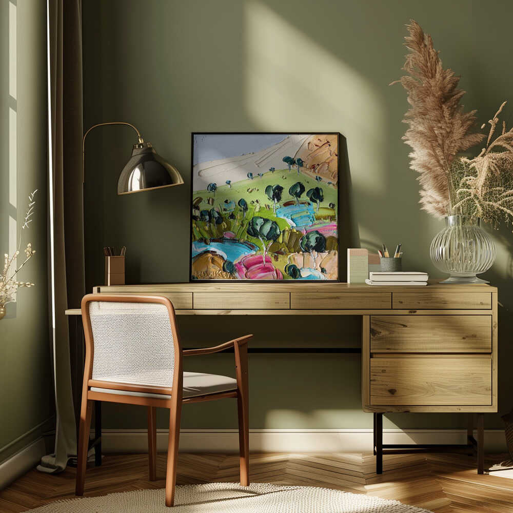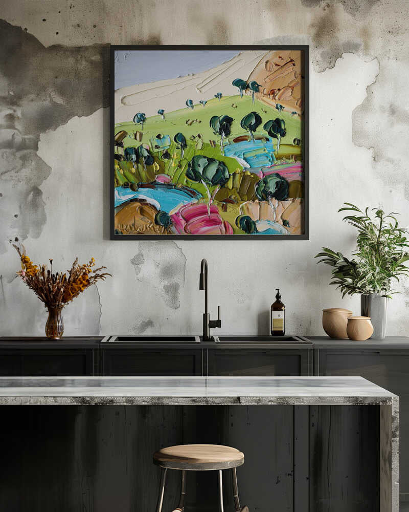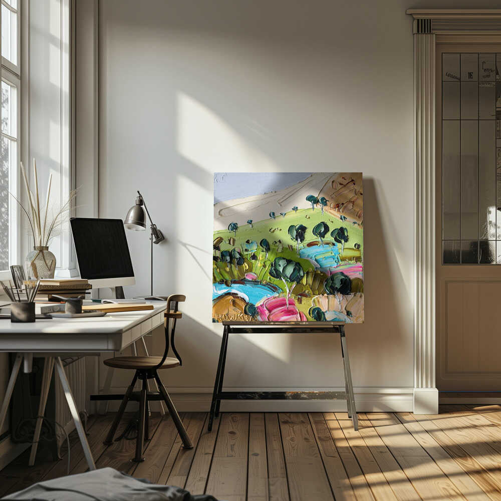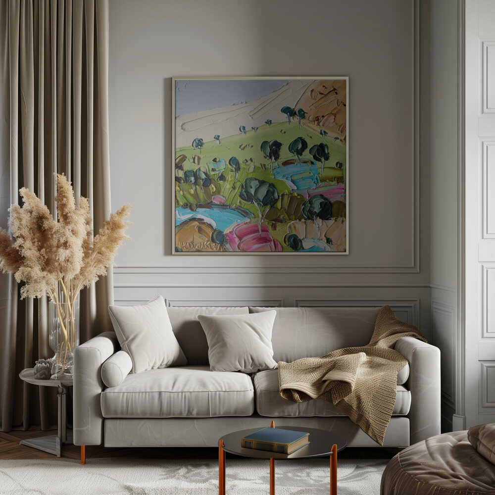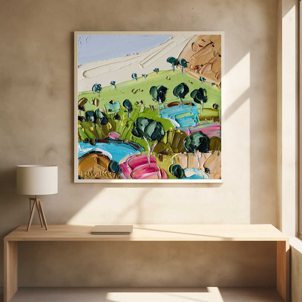 Impasto Countryside Landscape - Square Stretched Canvas, Poster or Fine Art Print by Angela Hawkey