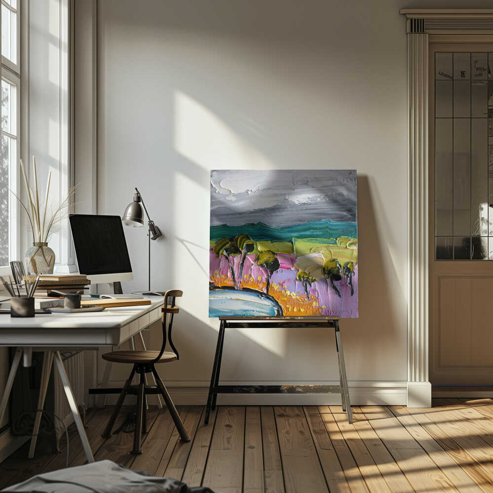 Impasto Countryside Landscape - Square Stretched Canvas, Poster or Fine Art Print by Angela Hawkey