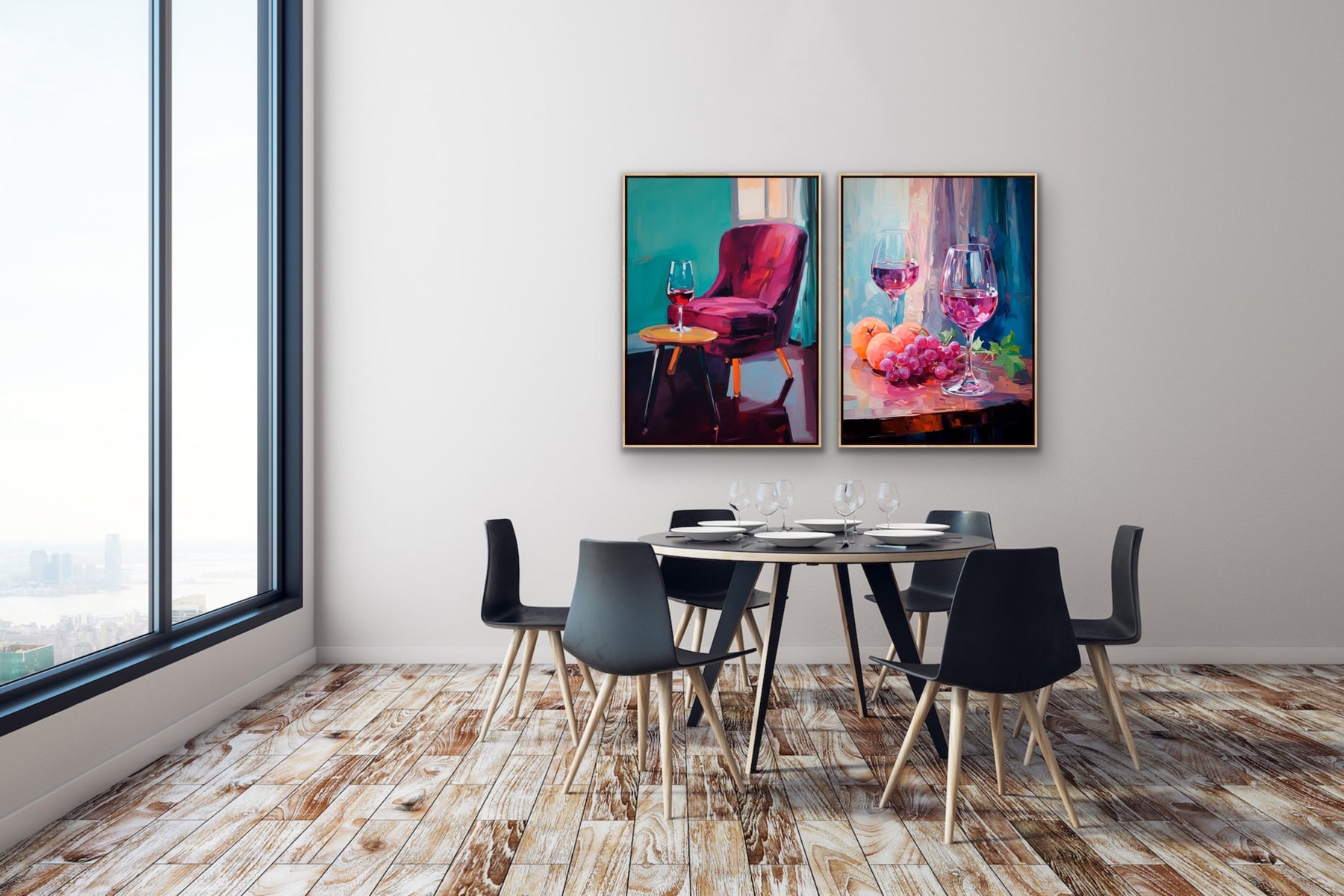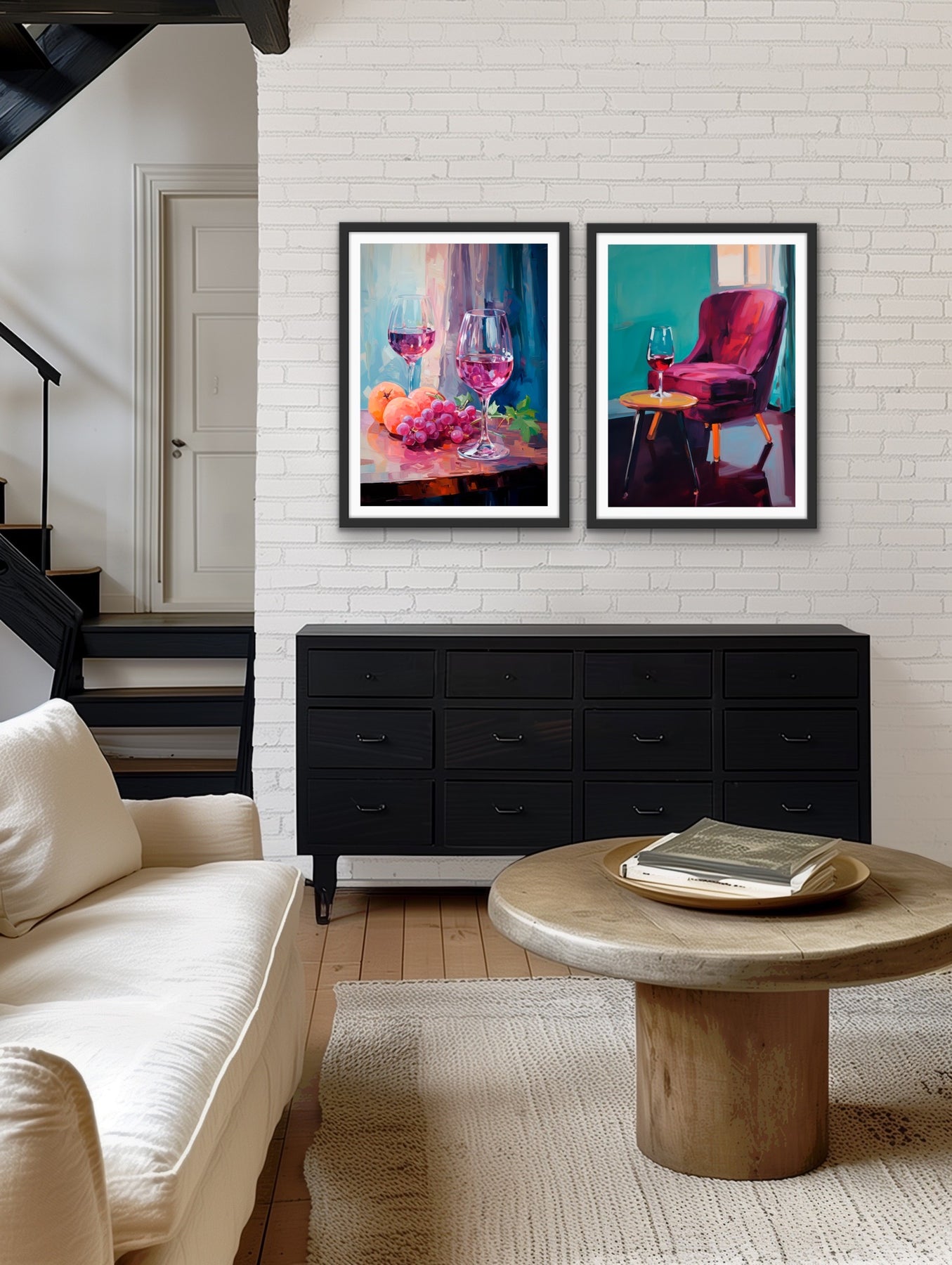 A bold, colourful set of two that's perfect for home or commercial spaces. Featuring a comfy armchair and a couple of glasses of red, these are the perfect bold still life prints.