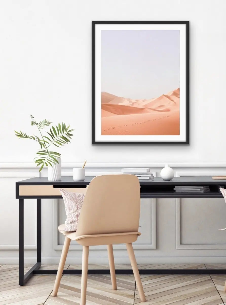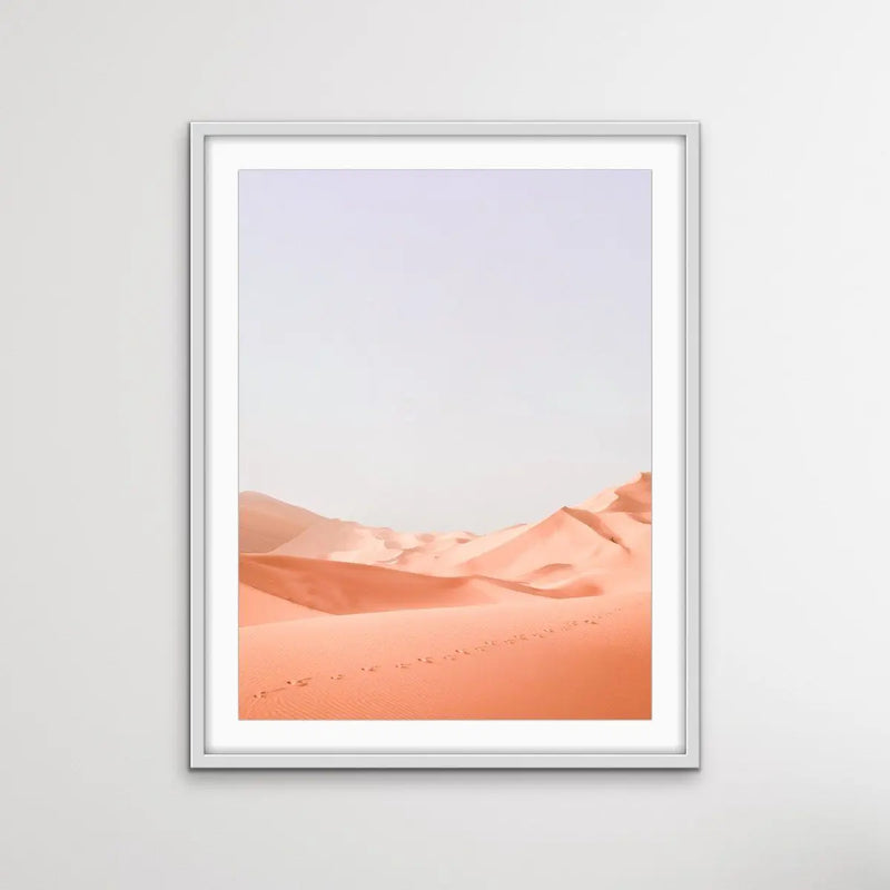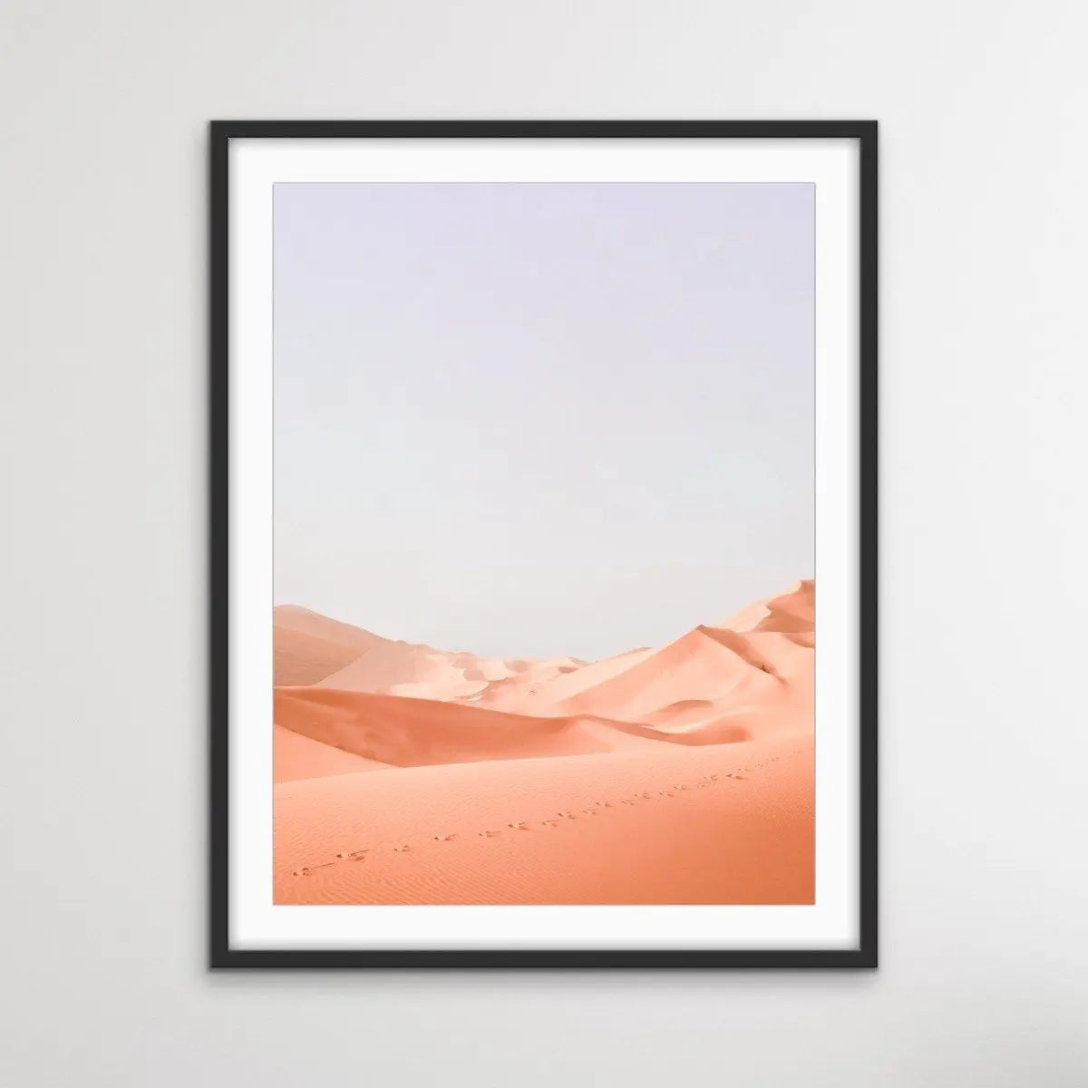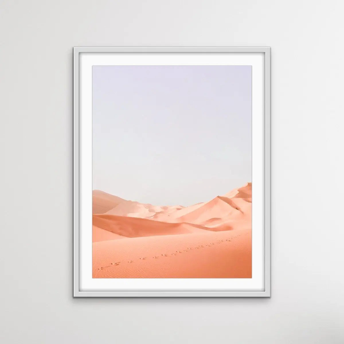 This dreamy desert photographic print features a soft, blush pink colour palette and shows a sting of footprints disappearing into the distance.