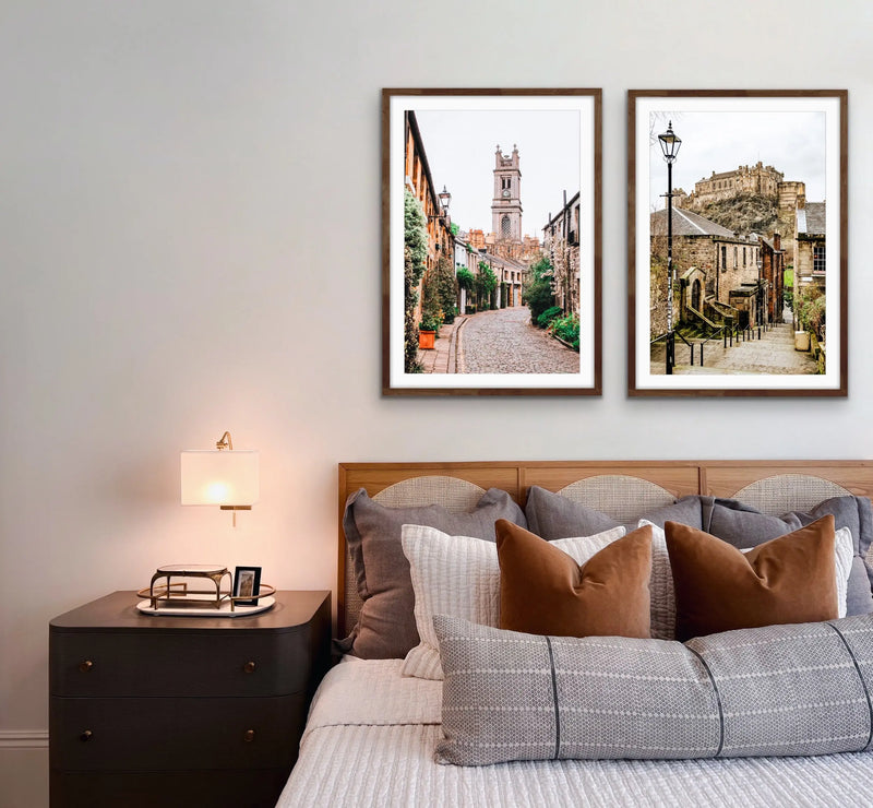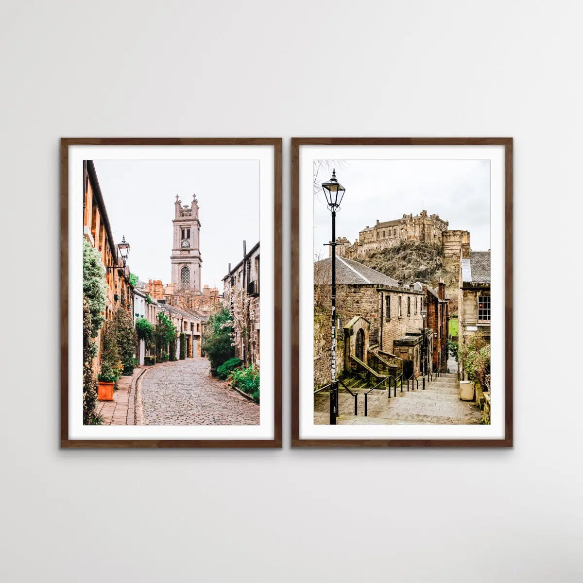This set of photographic prints features street scapes from beautiful Edinburgh, rendered in warm tones that enhance the city's natural beauty.
