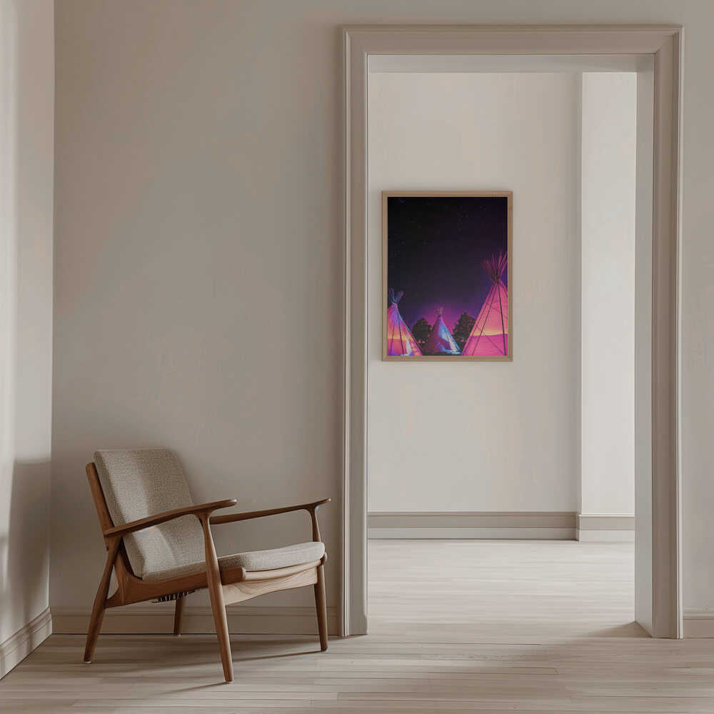 Explore our many print options for Vaporwave Teepees Glowing at Night Under Stars In Marfa Texas by artist Tom Windeknecht.