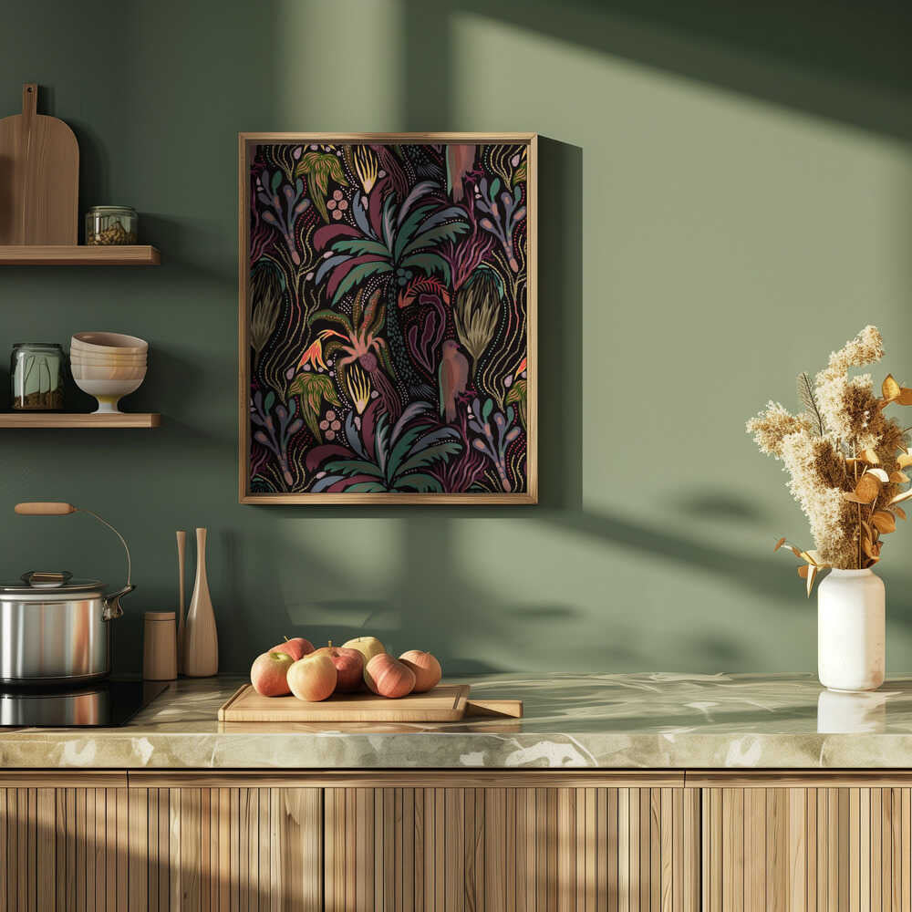 Explore our many print options for Dark Tropical Jungle Pattern by artist Josie George.