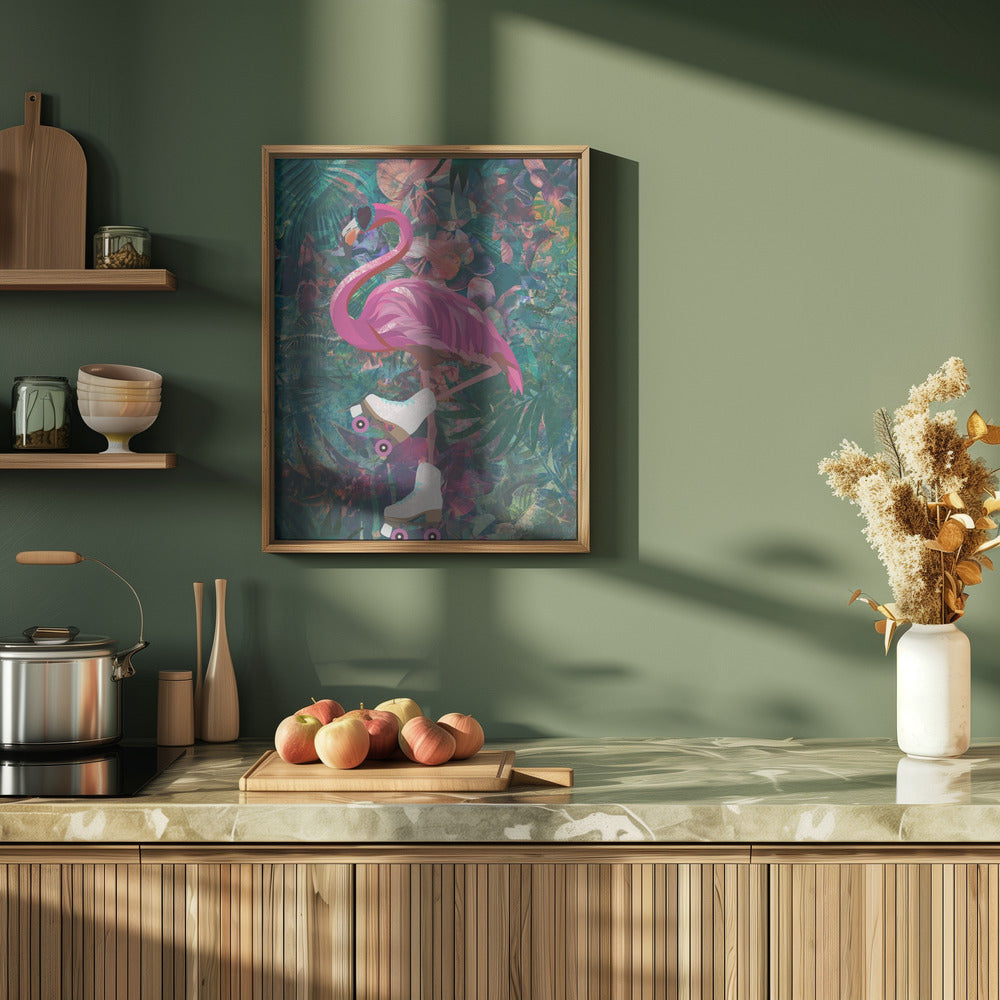 Explore our many print options for Tropical Floral Jungle - FLamingo rollerskating by artist Sarah Manovski.