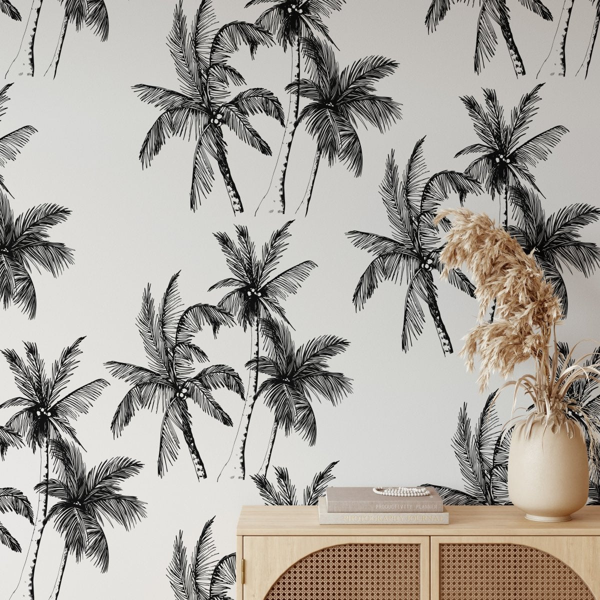 Palm Dreams in Black and White Wallpaper - White and Black Palm Tree Tropical Removable Peel and Stick or Soak and Stick Wallpaper