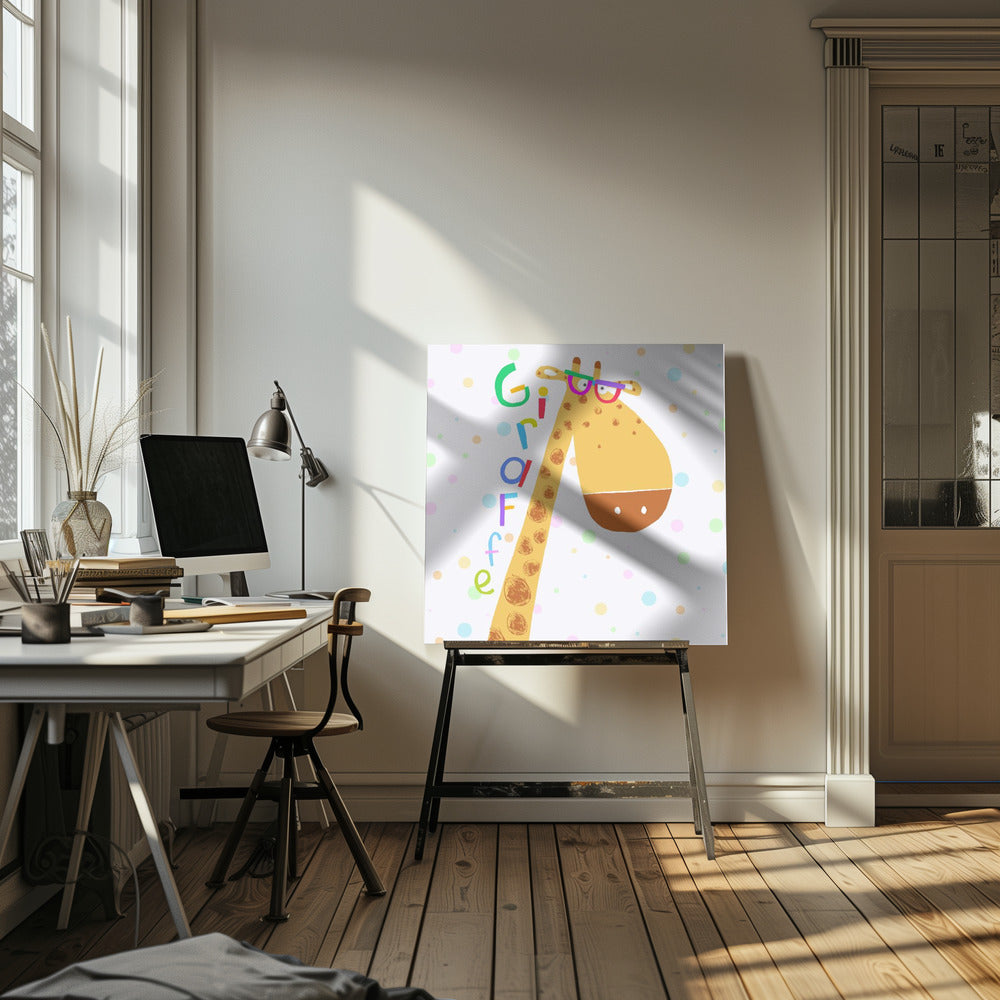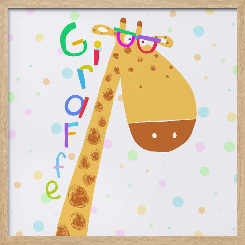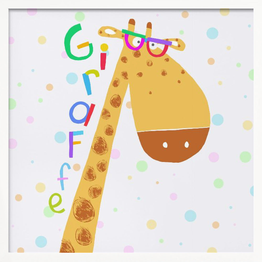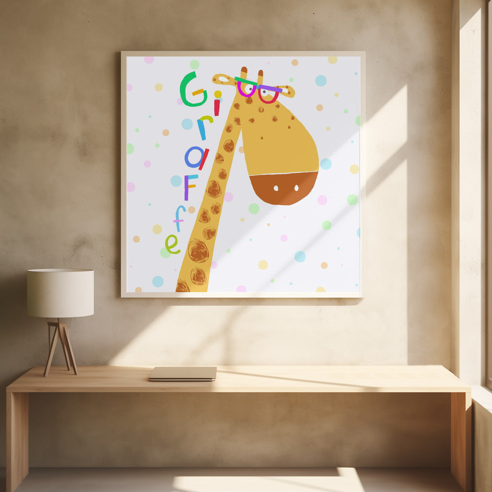 Explore our many print options for Cute Giraffe Wearing Glasses with Colorful Text by Carla Daly by artist Carla Daly.