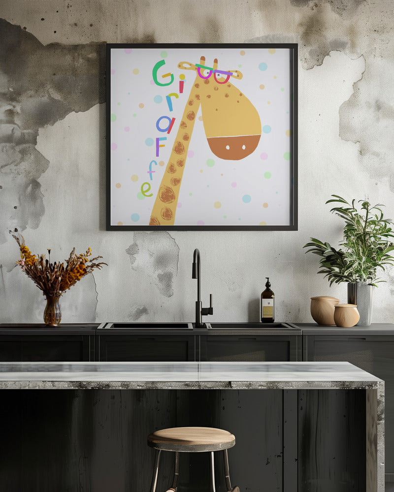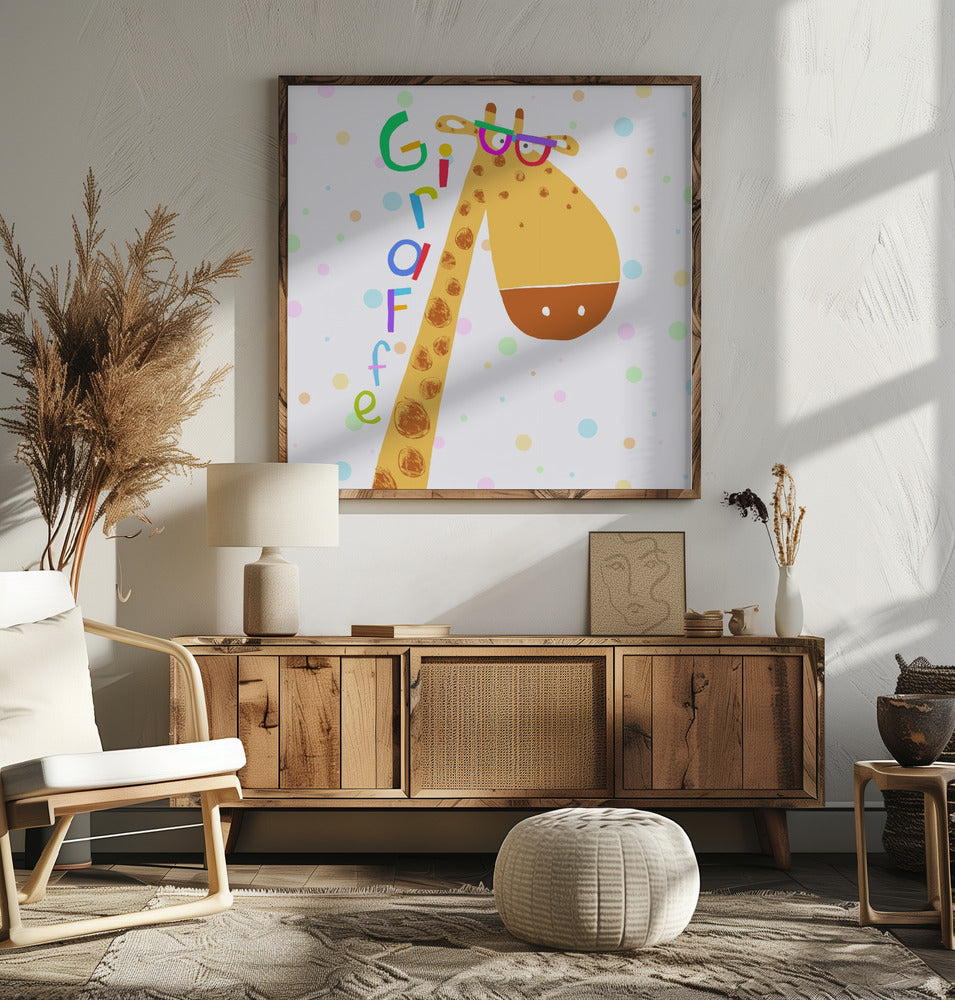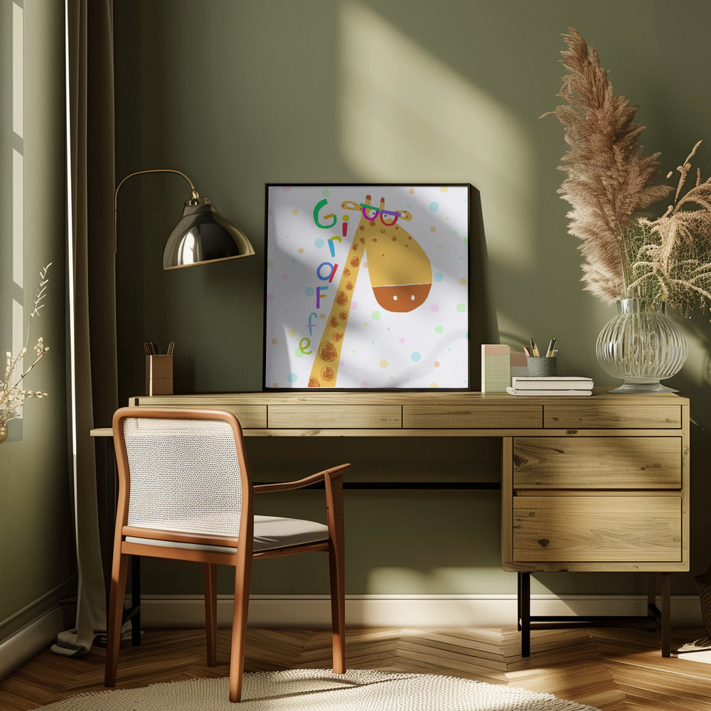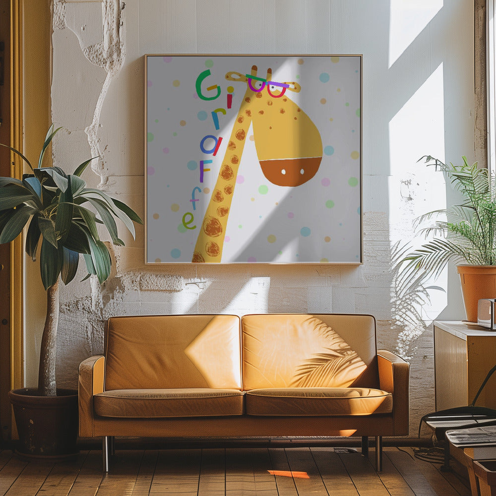 Explore our many print options for Cute Giraffe Wearing Glasses with Colorful Text by Carla Daly by artist Carla Daly.