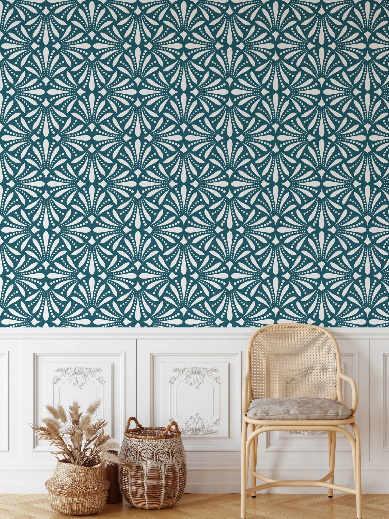 This vintage-inspired teal-coloured wallpaper is perfect for creating dark, rich-colour spaces in your home.
