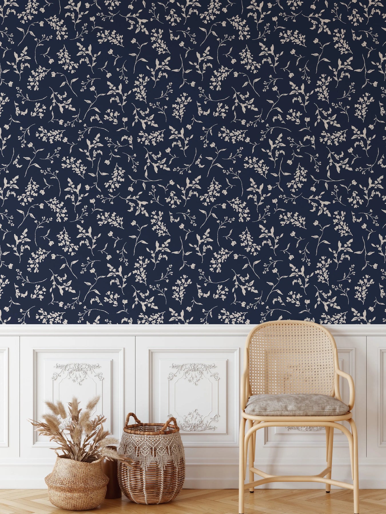'Lulu In Navy Blue' - Vintage Blue and Cream Leaf Removable Wallpaper
