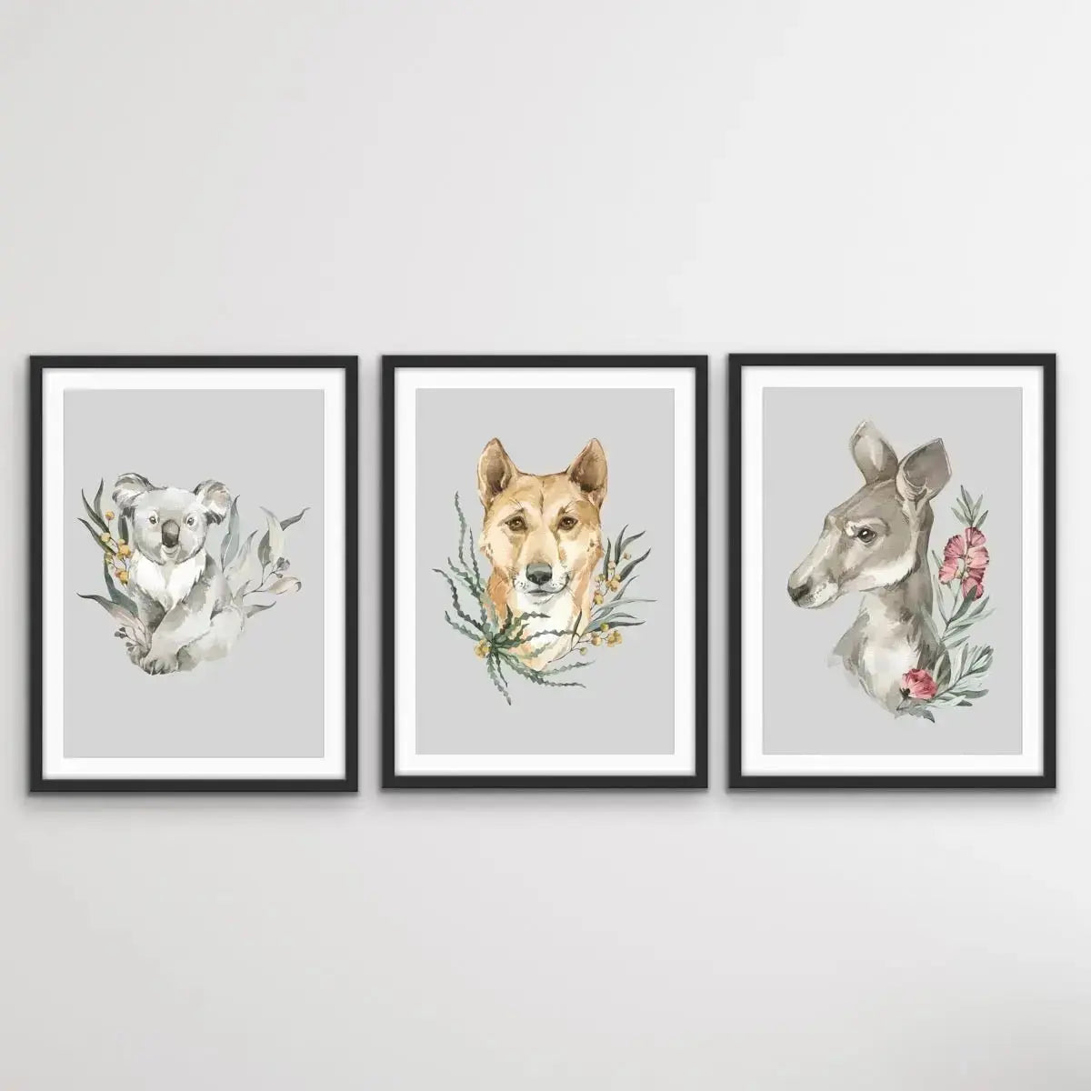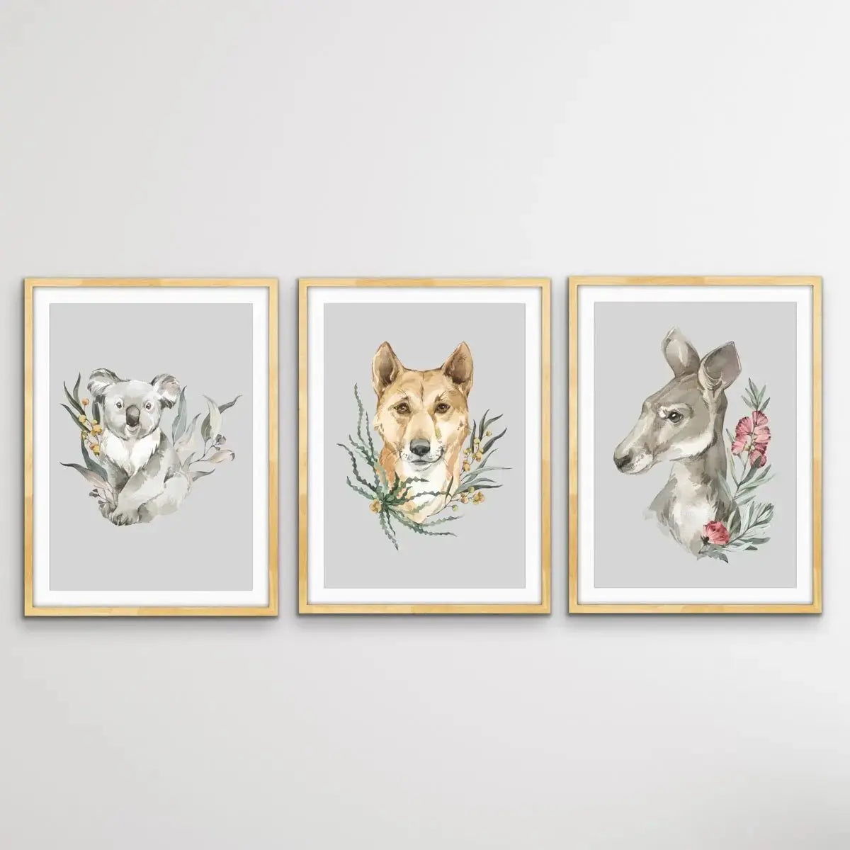 Complete your little one's space (or your own!) with our second set of Australian native animal watercolour prints. This set features a koala, dingo and kangaroo adorned with native flowers