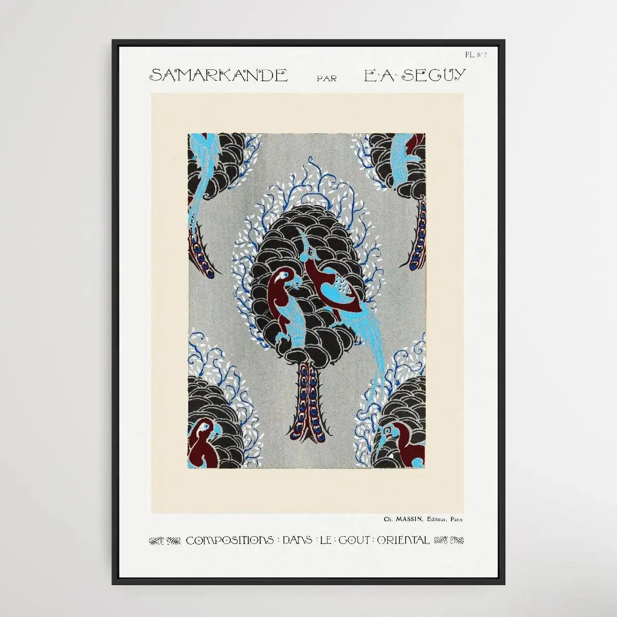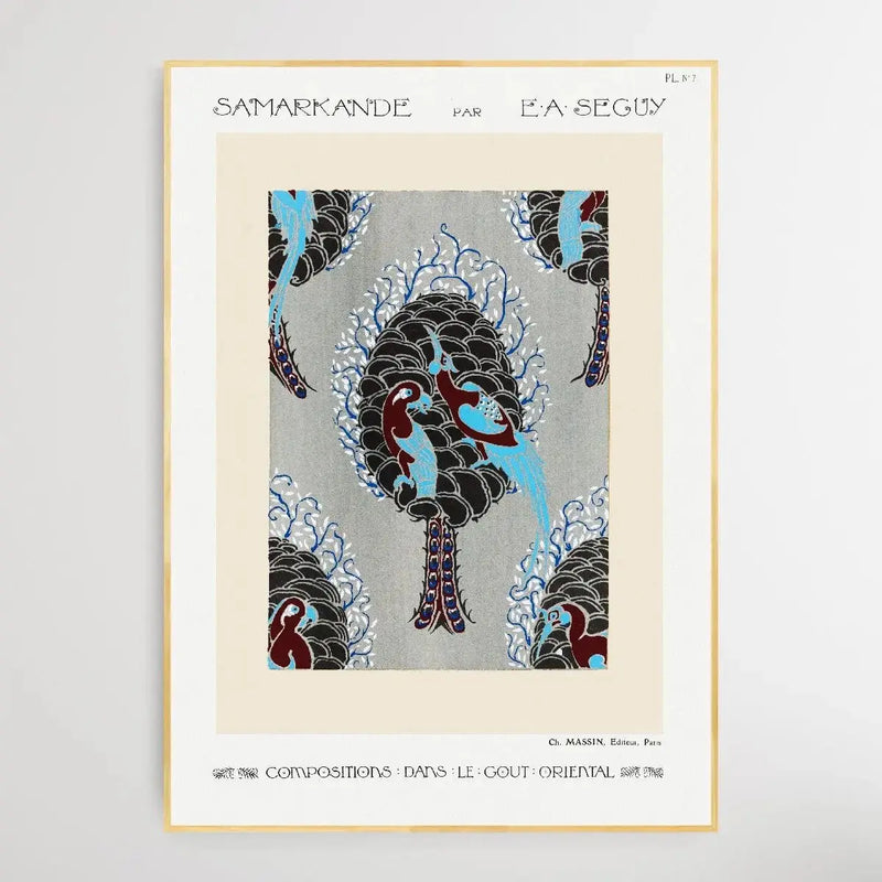 Art Nouveau bird pattern pochoir print in oriental style. Original from the 1914 edition of Samarkande: 20 Compositions en couleurs dans le Style oriental" (Samarkand: 20 Color Compositions in the Oriental Style) by E. A. Séguy.