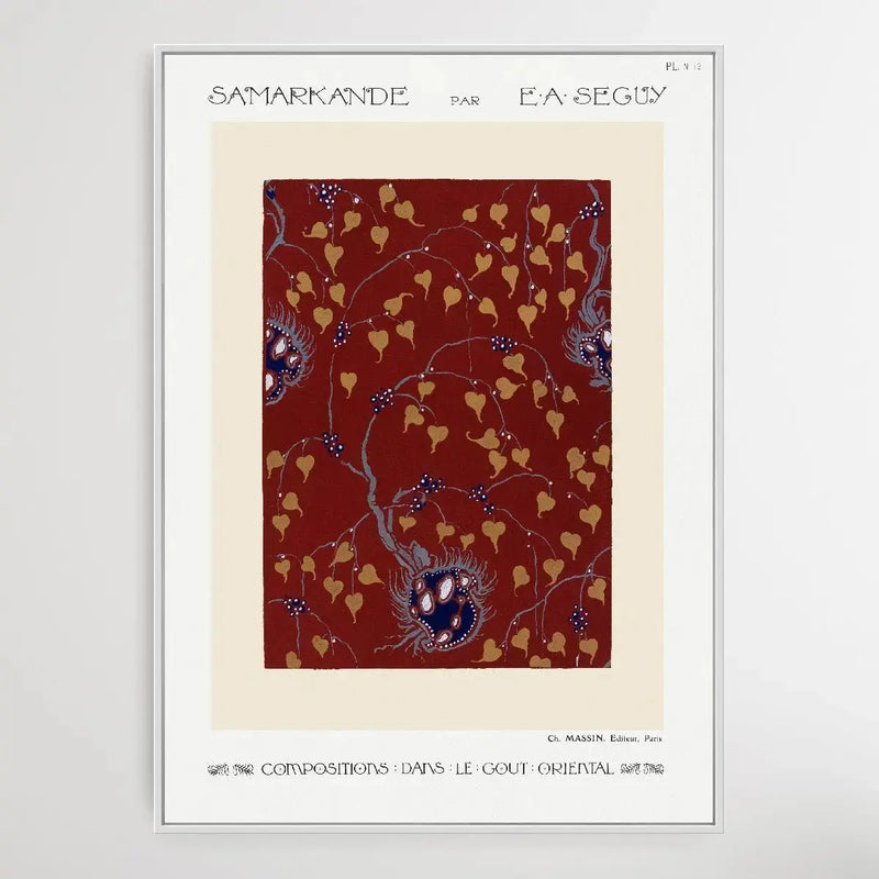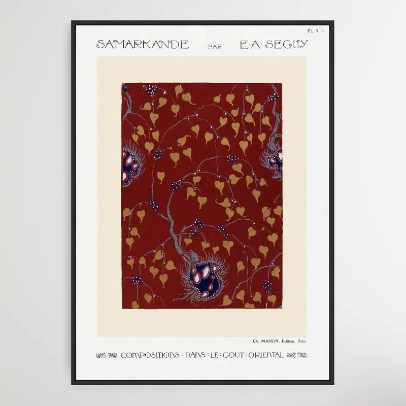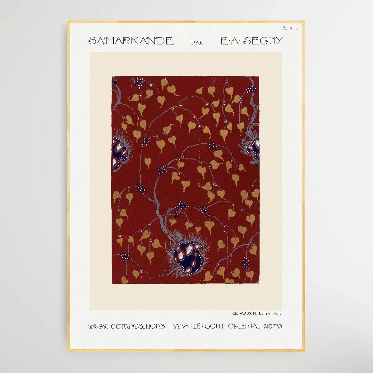 Art Nouveau flower pattern pochoir print in oriental style. Original from the 1914 edition of Samarkande: 20 Compositions en couleurs dans le Style oriental" (Samarkand: 20 Color Compositions in the Oriental Style) by E. A. Séguy.