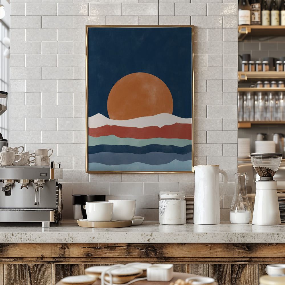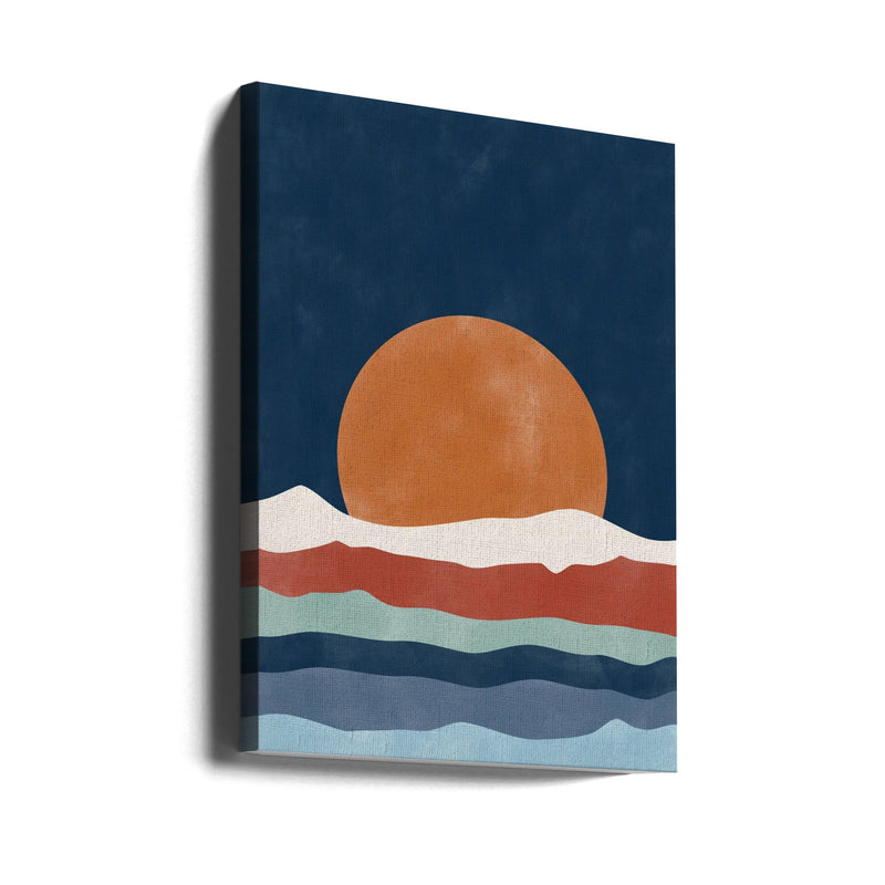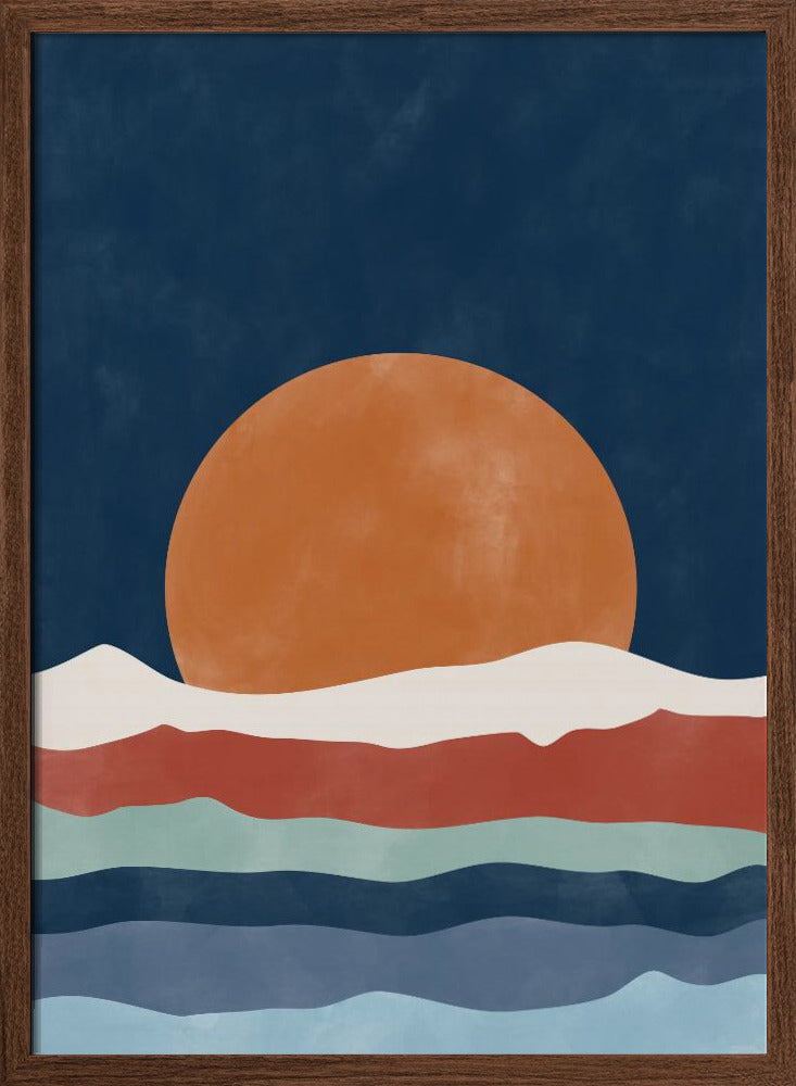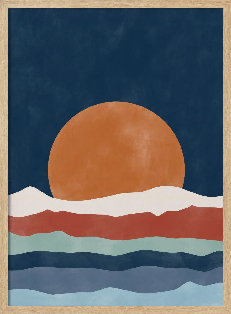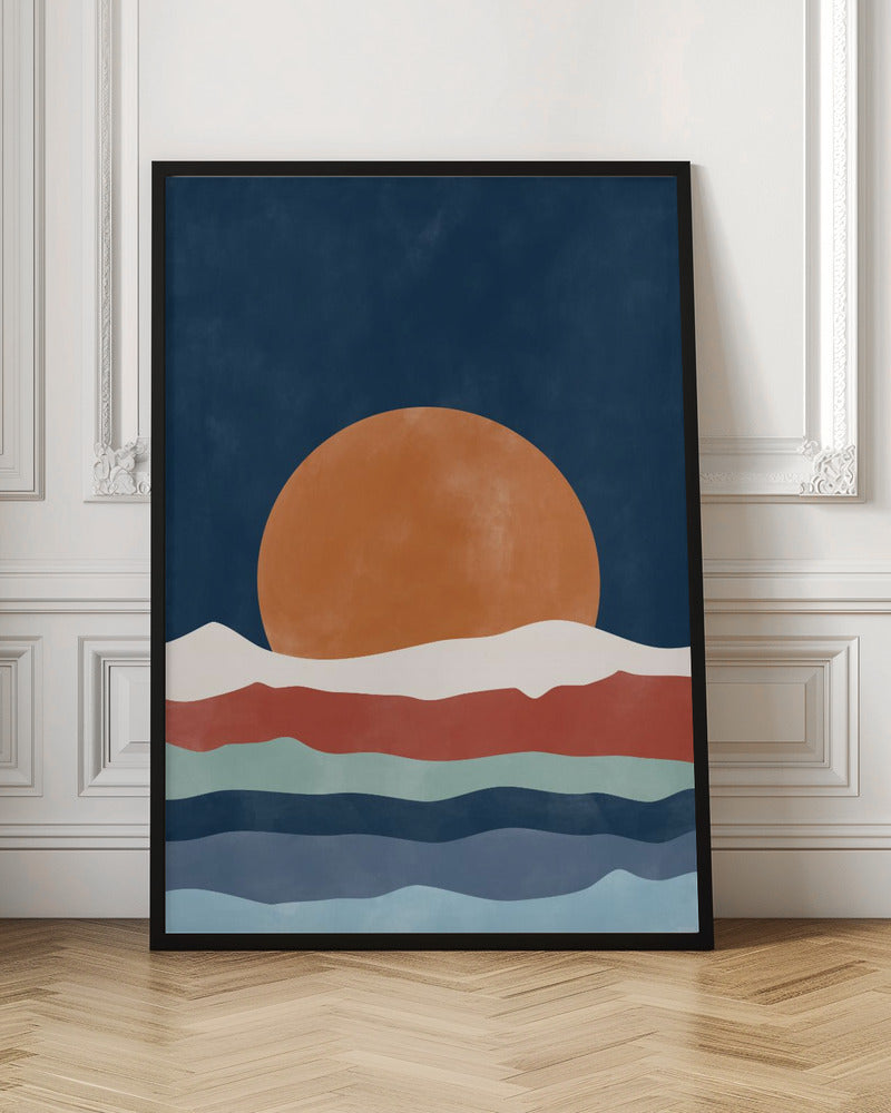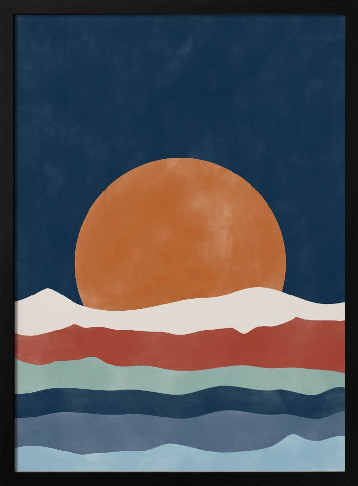 Explore our many print options for Large Orange Sun Setting Over Stylized Waves by artist Elena Ristova.