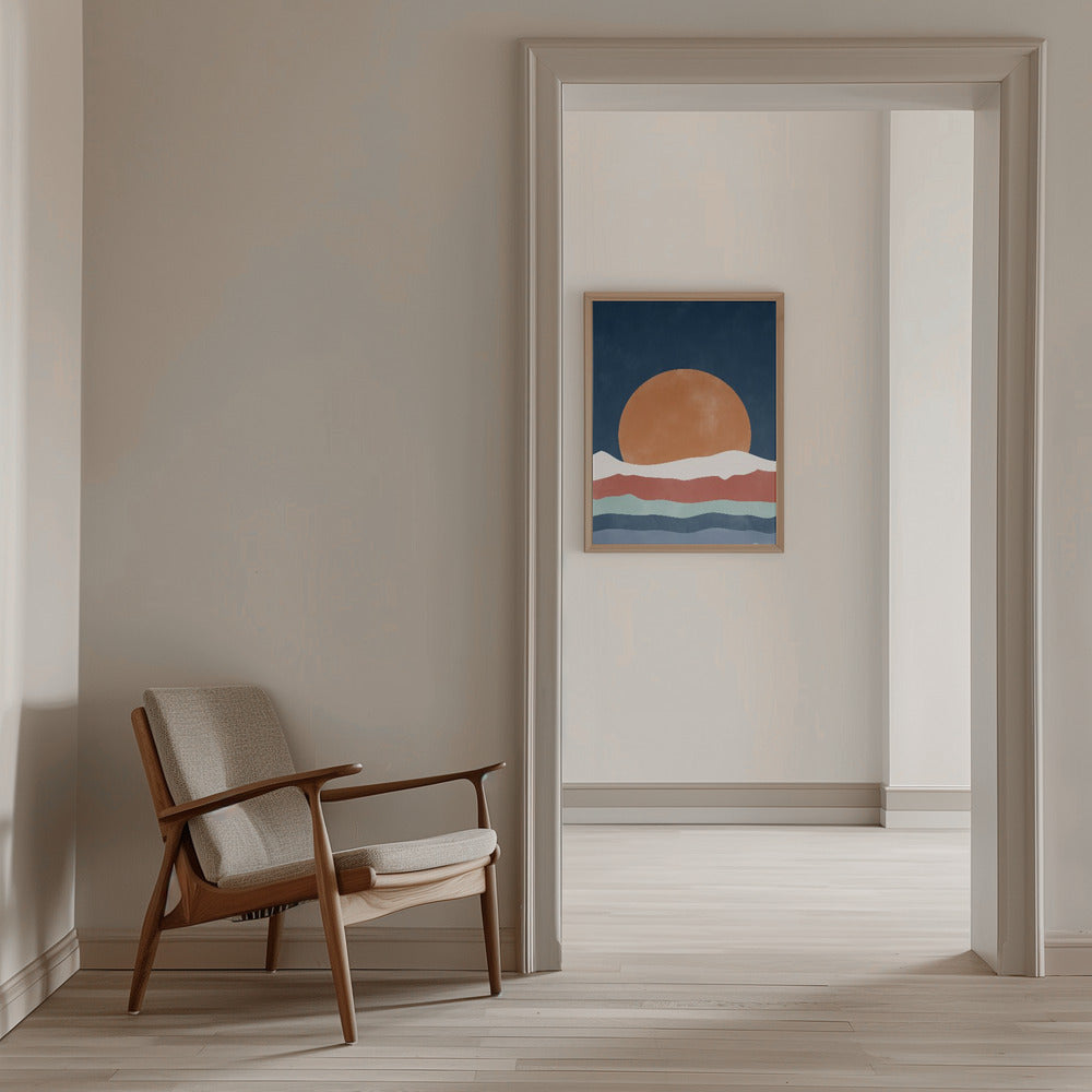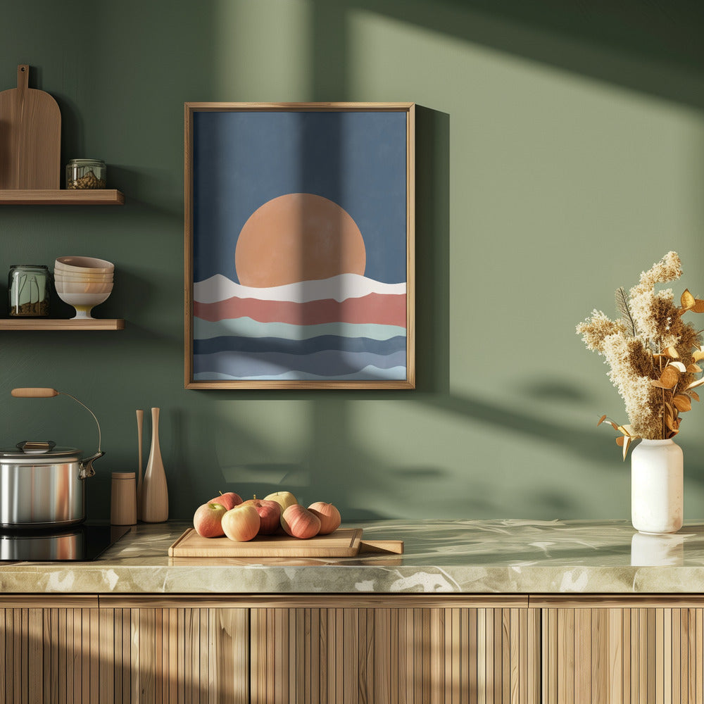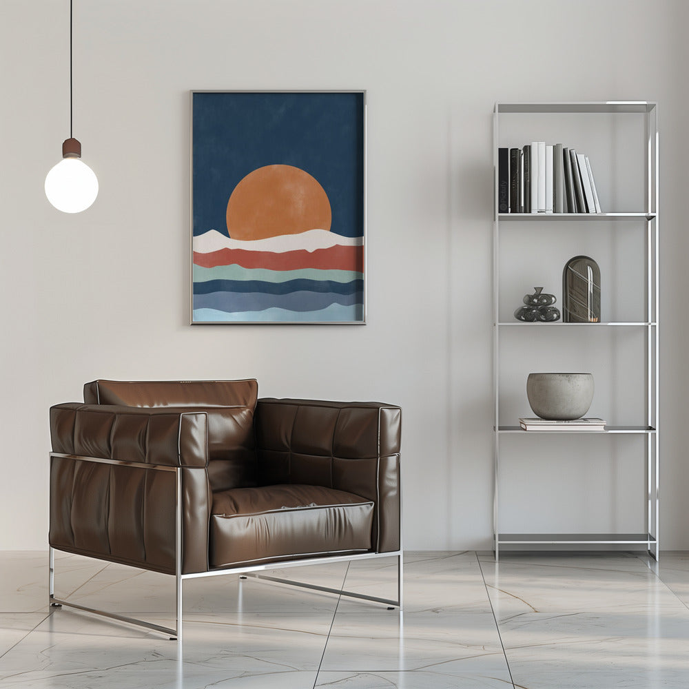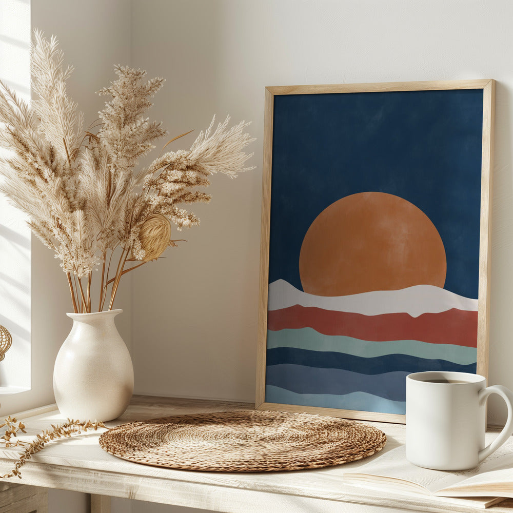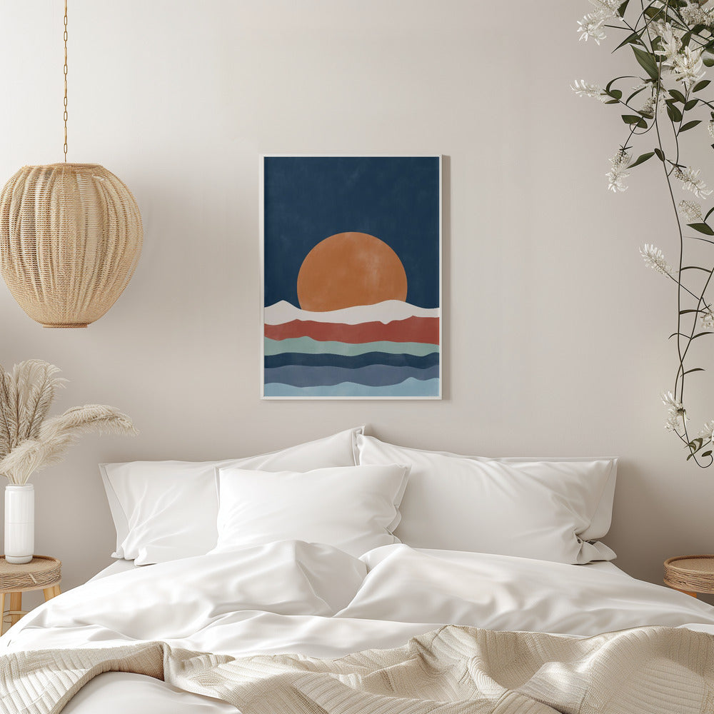 Explore our many print options for Large Orange Sun Setting Over Stylized Waves by artist Elena Ristova.