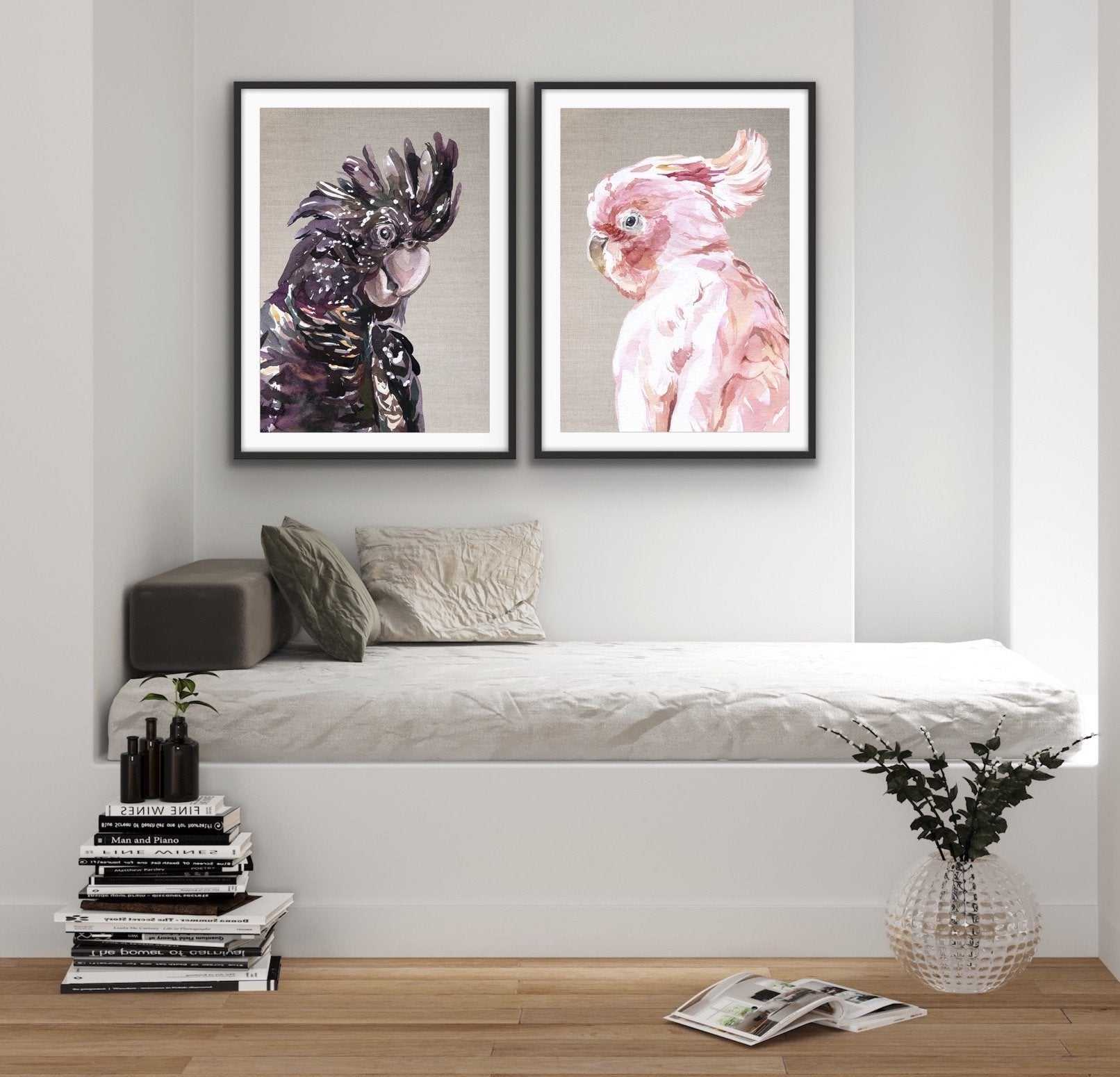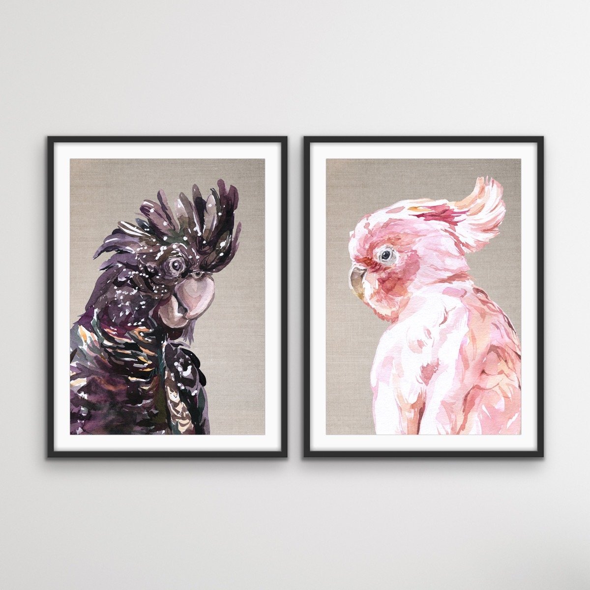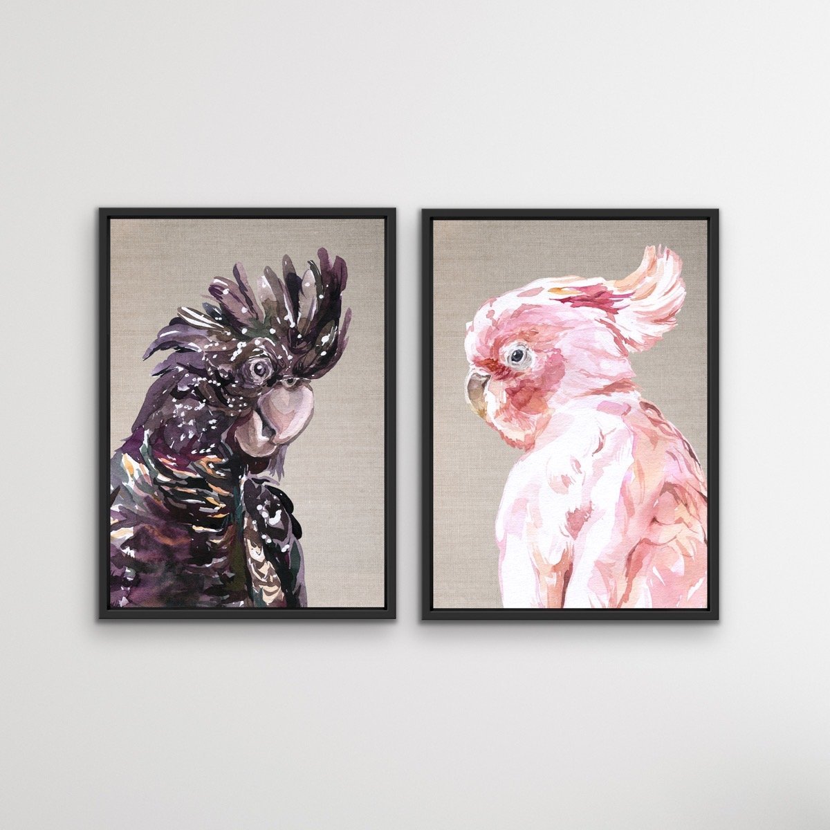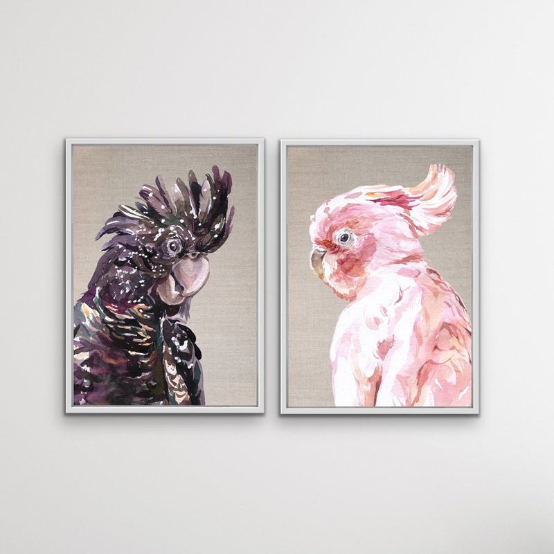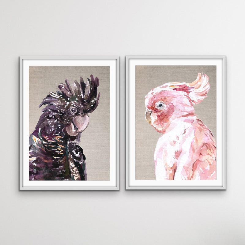This sweet pair of watercolour paintings feature a pink cockatoo and black cockatoo. This set comes with a linen background butis also available with a white background.