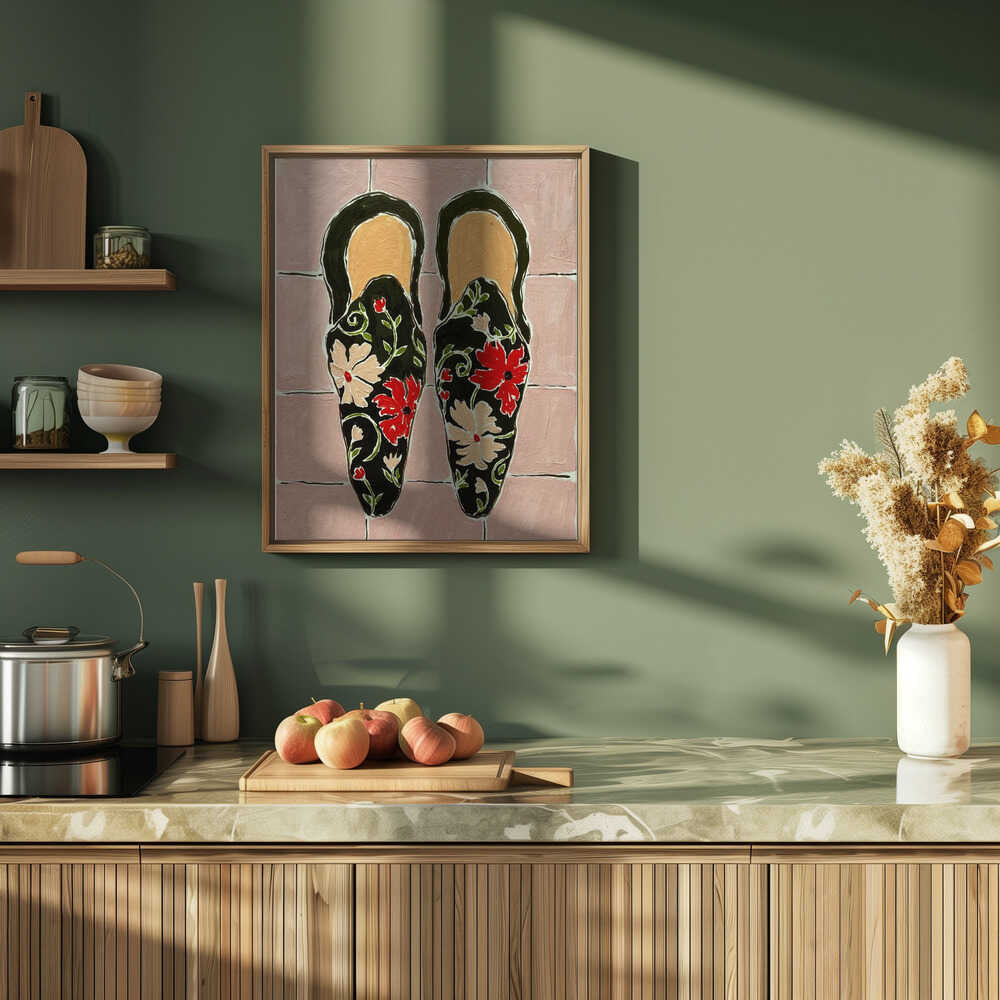 Explore our many print options for Black Shoes On Pink Tiles by artist Rushati Chowdhury.