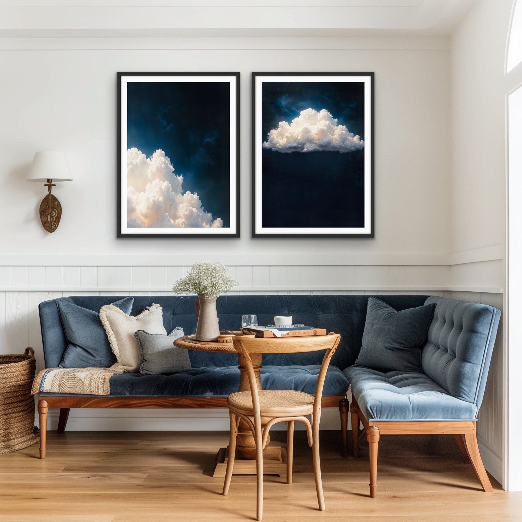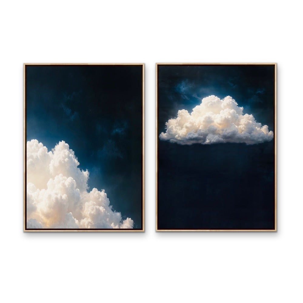 This dramatic set of two prints features fluffy white clouds against a dark blue sky, with specks of light calling from the distance.