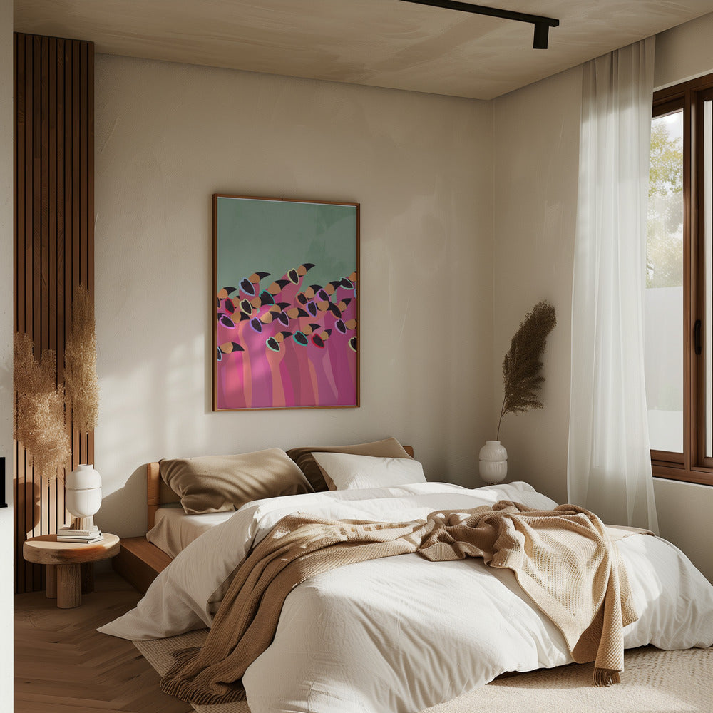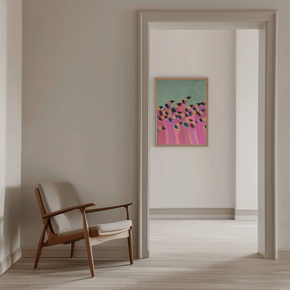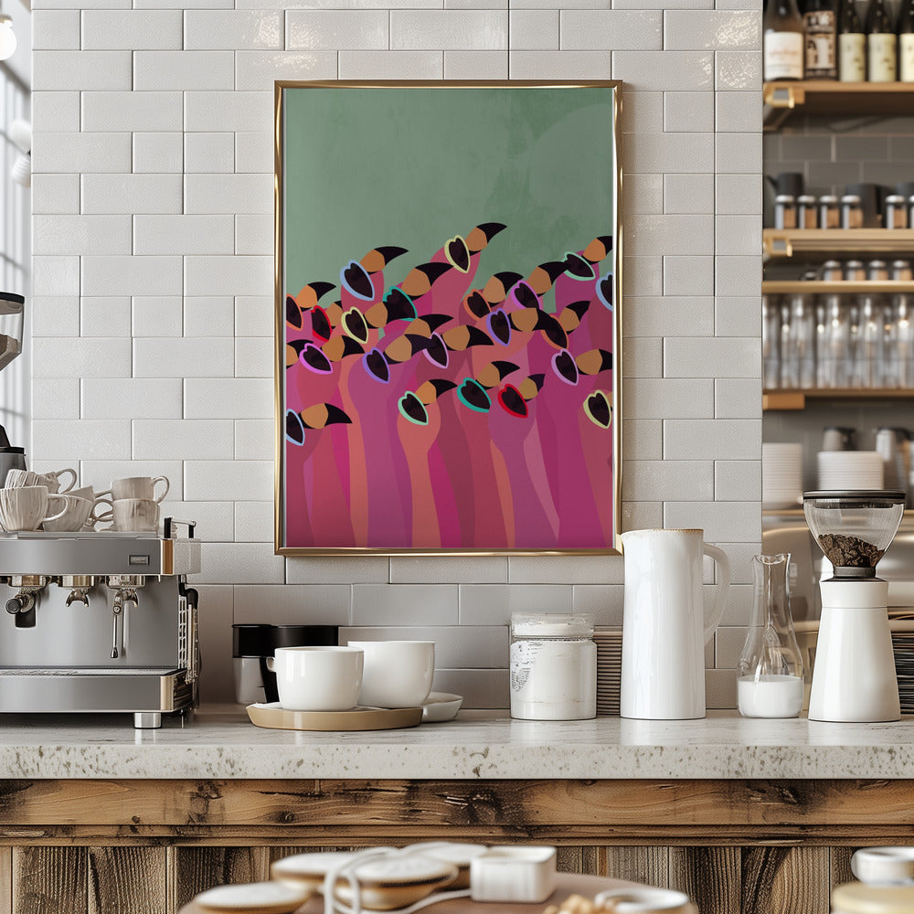Explore our many print options for Flock Flamingos green by artist Sarah Manovski.