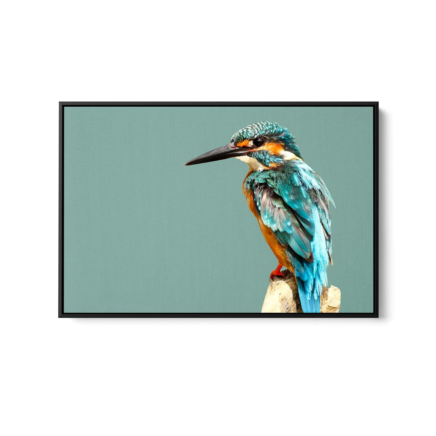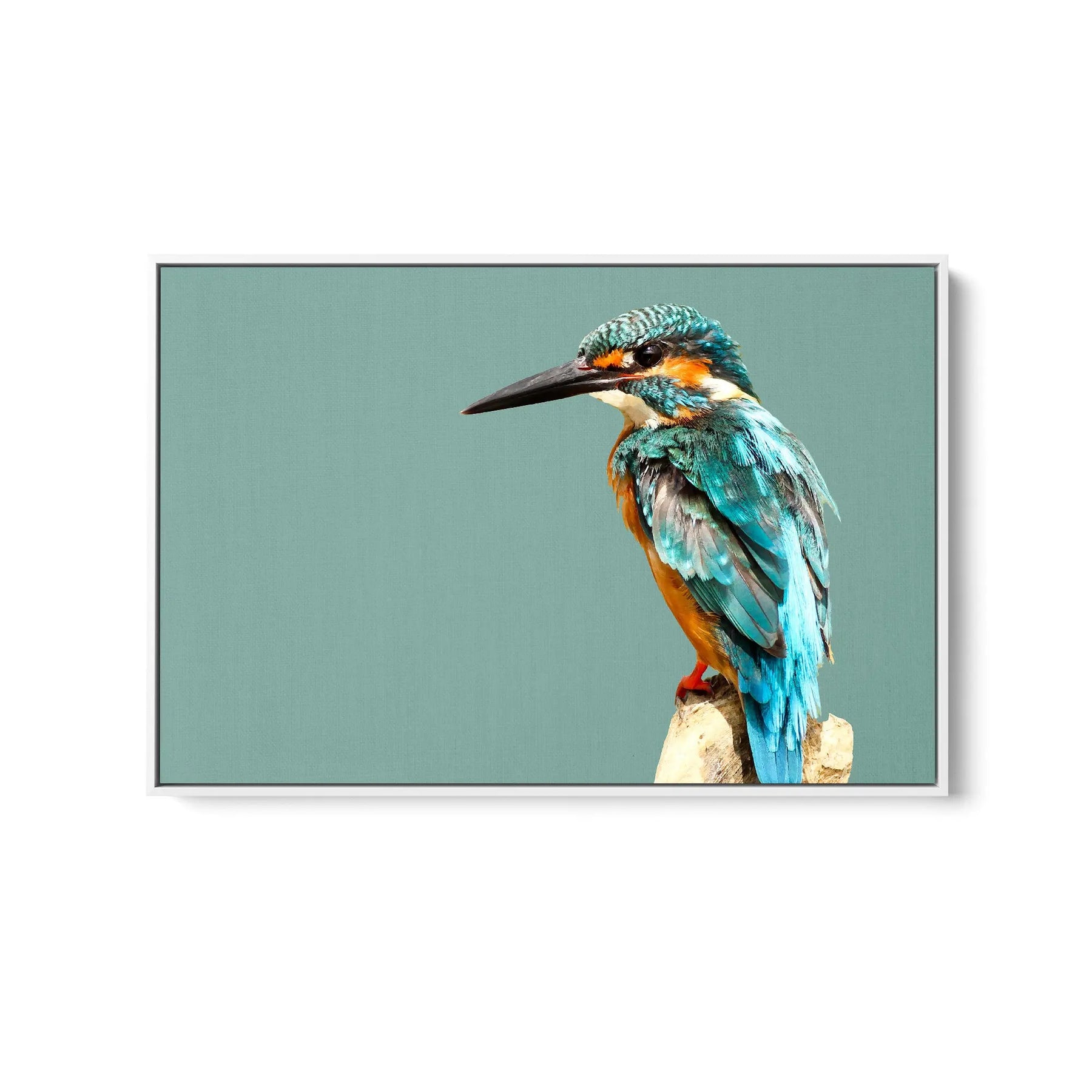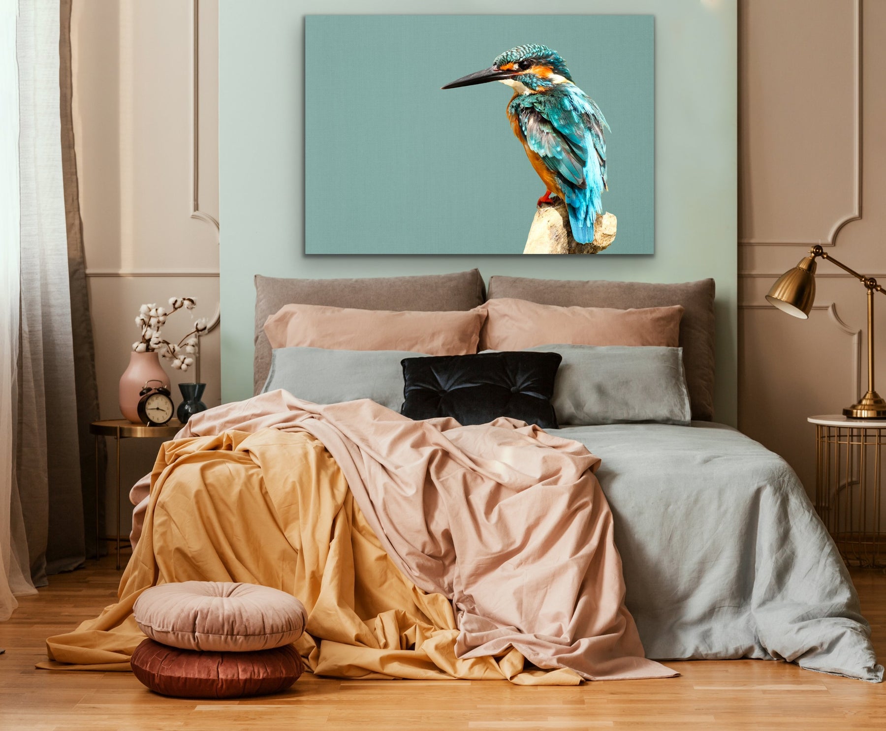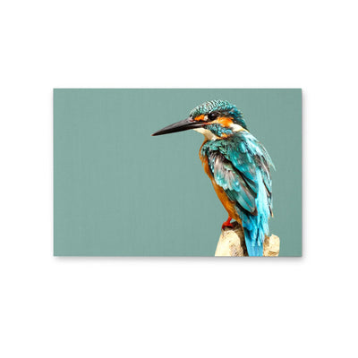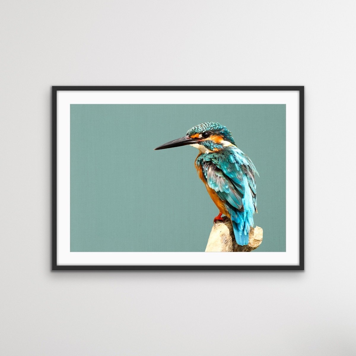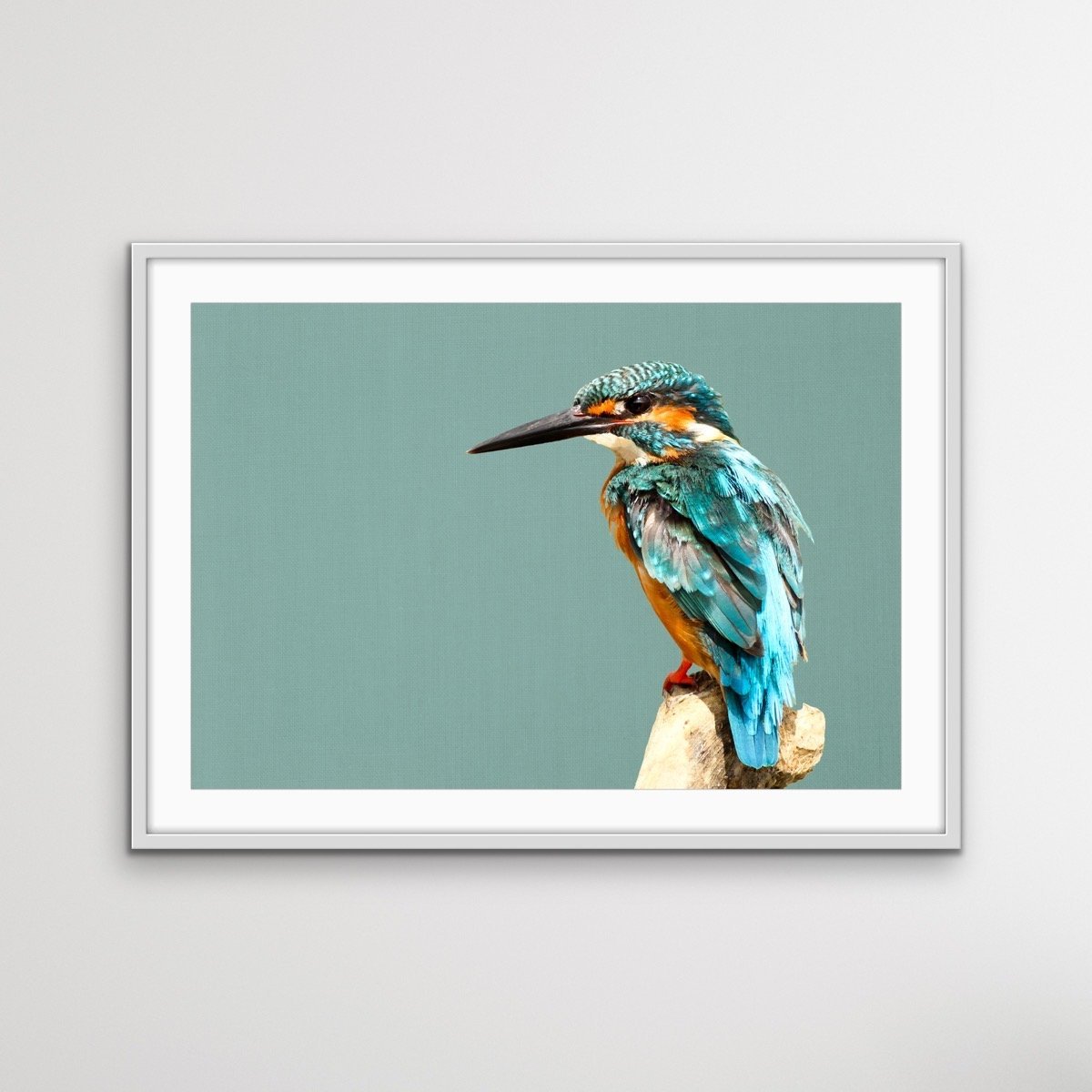 This beautiful, vivid kingfisher is captured in front of a turquoise linen background. The perfect piece for any bird lover looking for something beautiful and bold.
