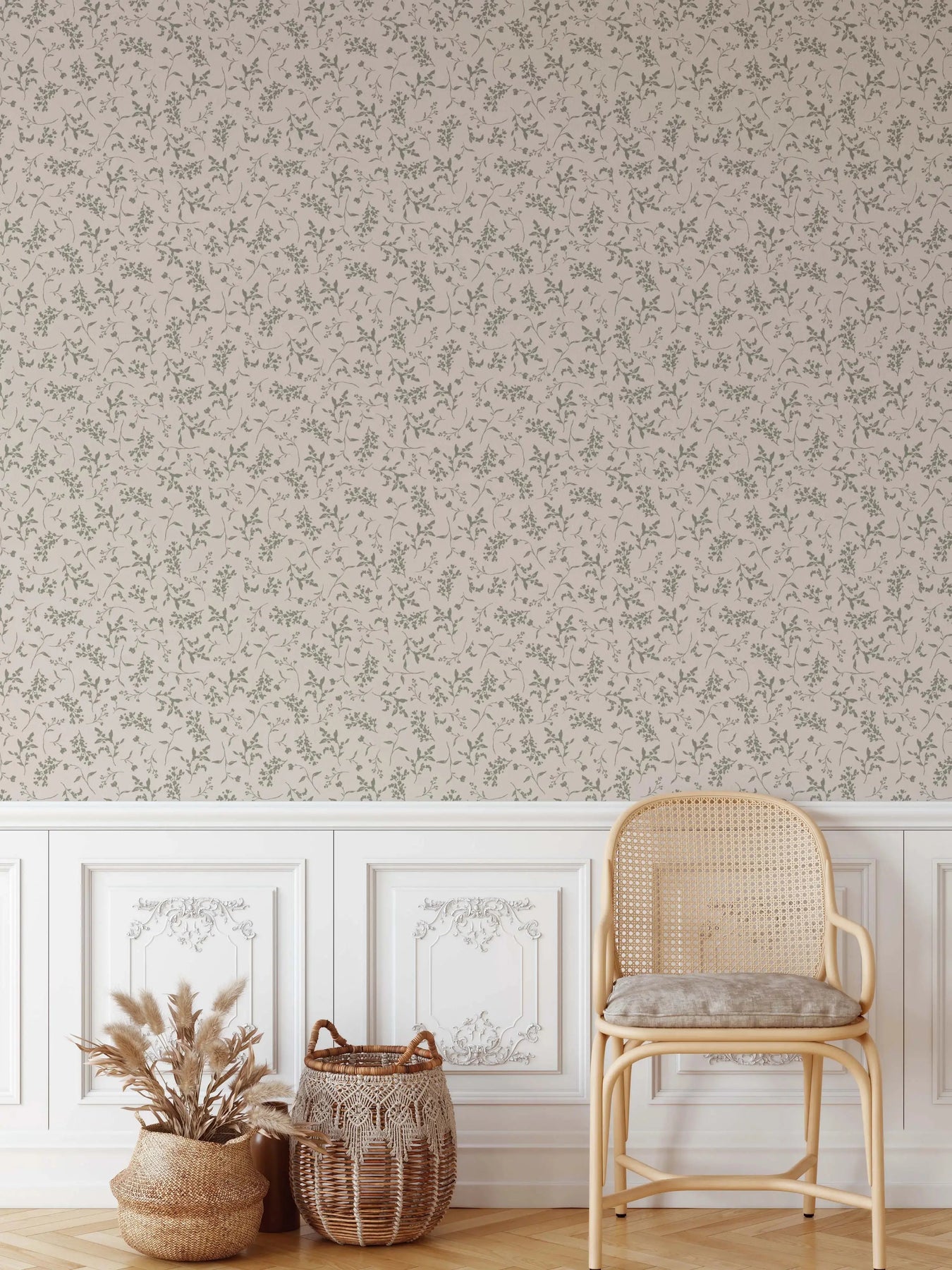 'Lulu In Green' - Vintage Green and Cream Leaf Removable Wallpaper