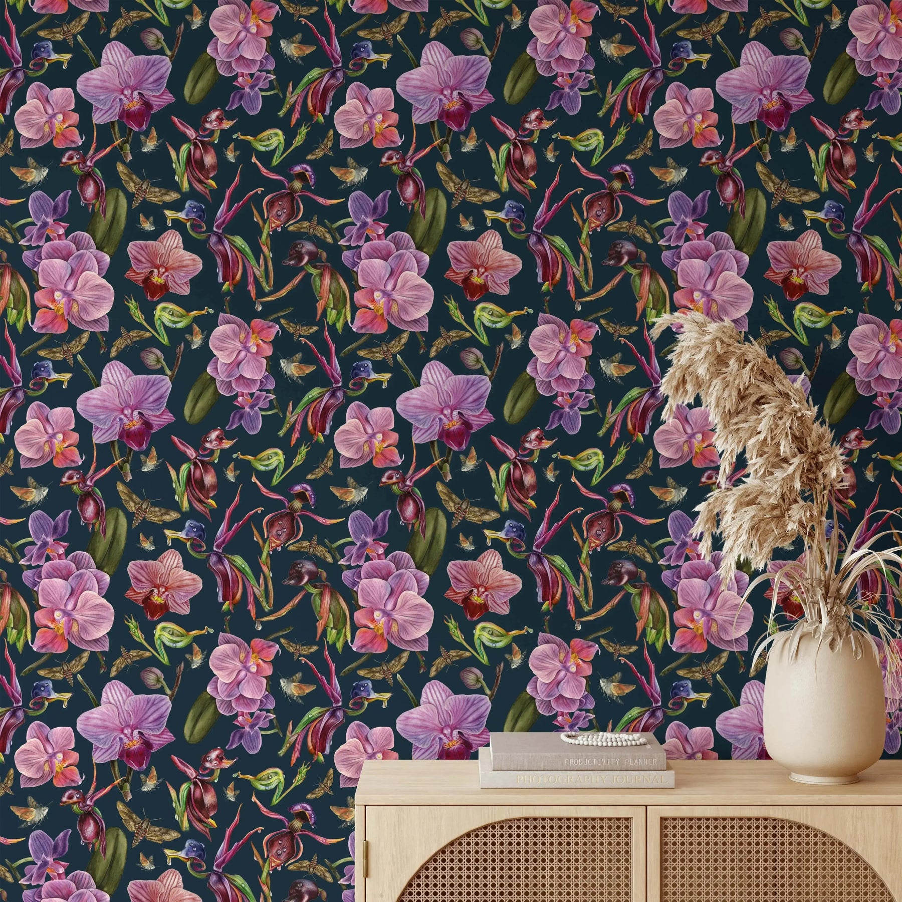Orchid Garden - Dark Green and Pink Floral Watercolour Wallpaper