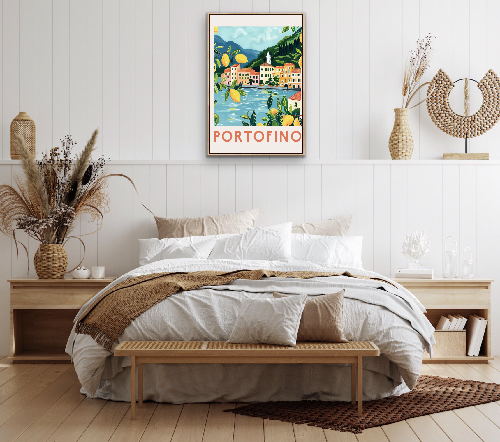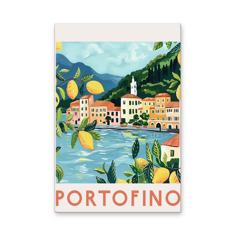 Explore our many print options for our 'Portofino Travel Poster', abundant with lemons and show casing the beautiful coast of Italy.