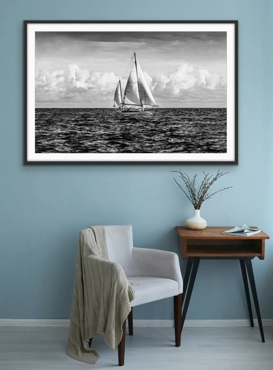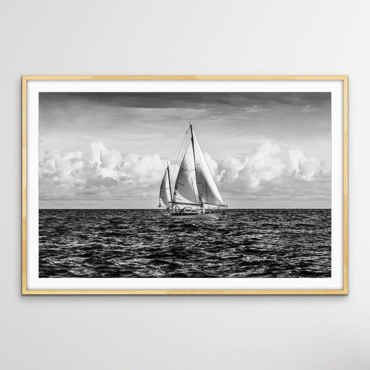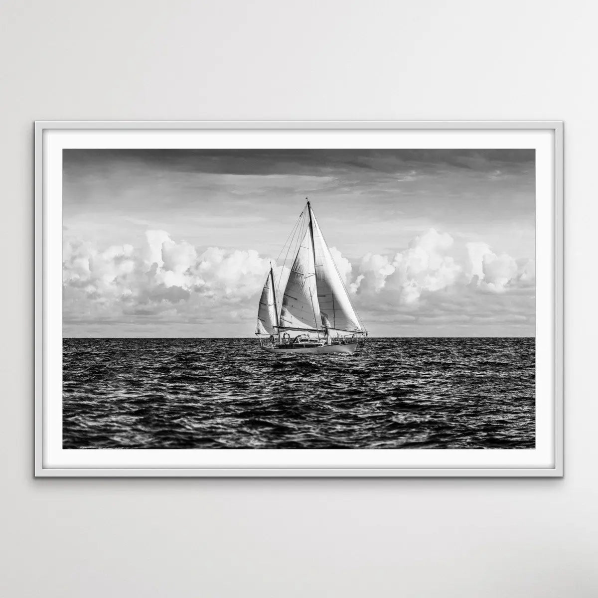 A Day On the Ocean - Black and White Yacht Sailing Photographic Canvas or Art Print