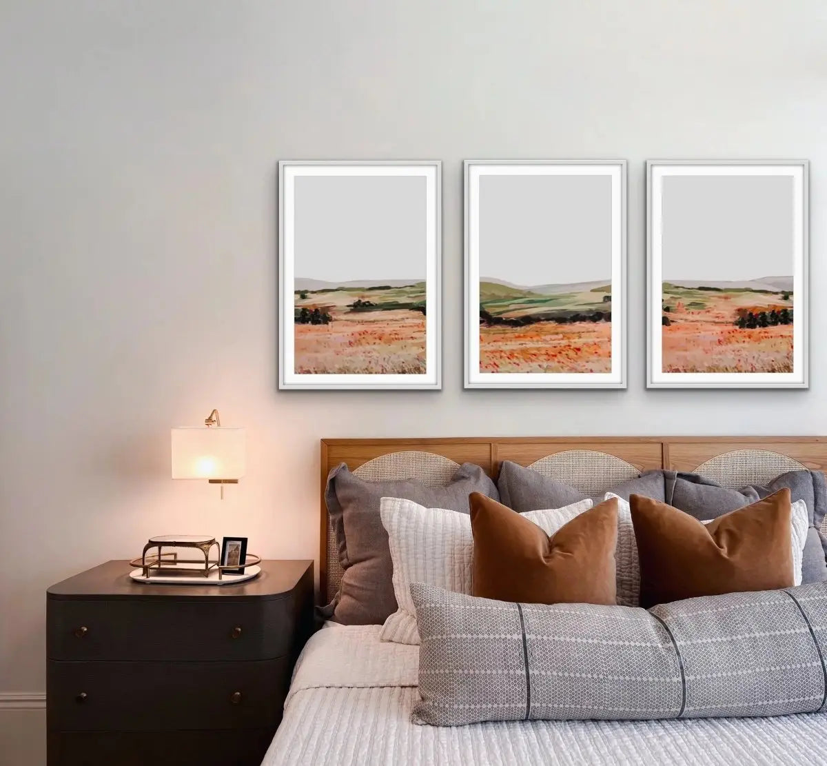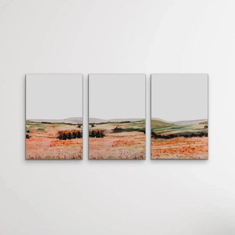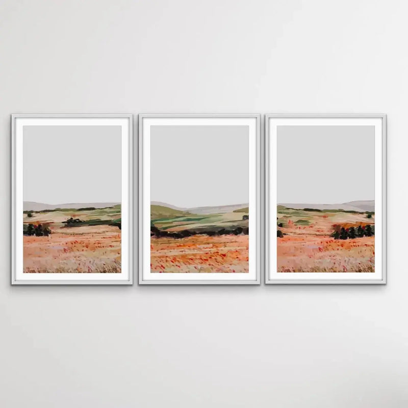 Enjoy the vista of rolling hills captured in this stunning three piece print set. Shades of orange and green stand out against a grey sky with wildflowers in the foreground.