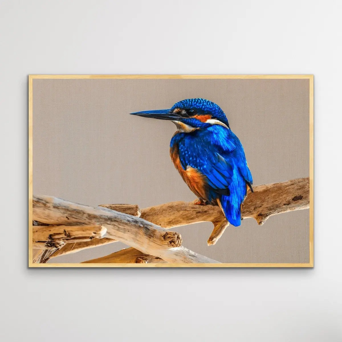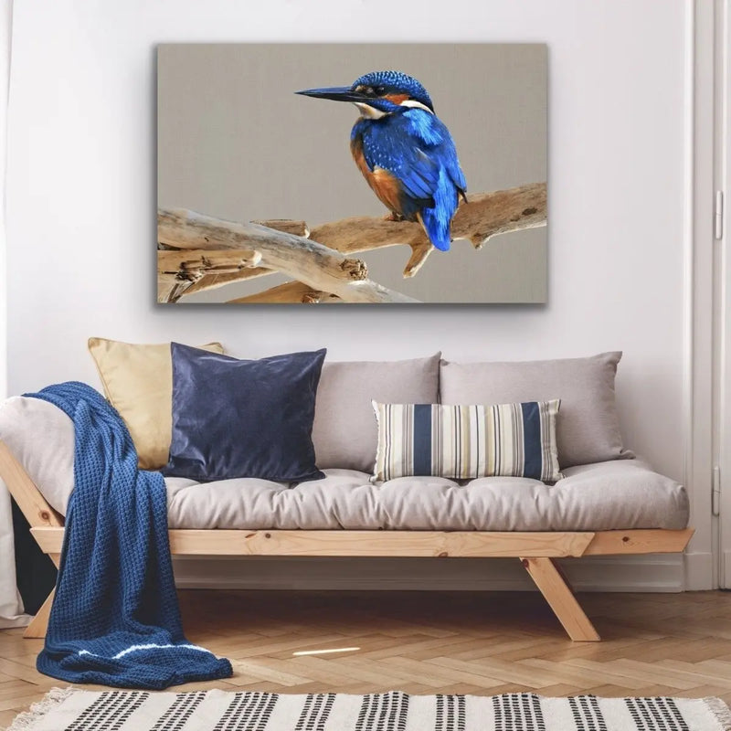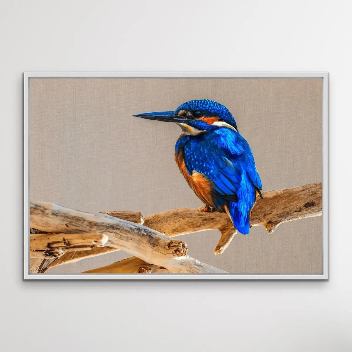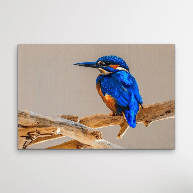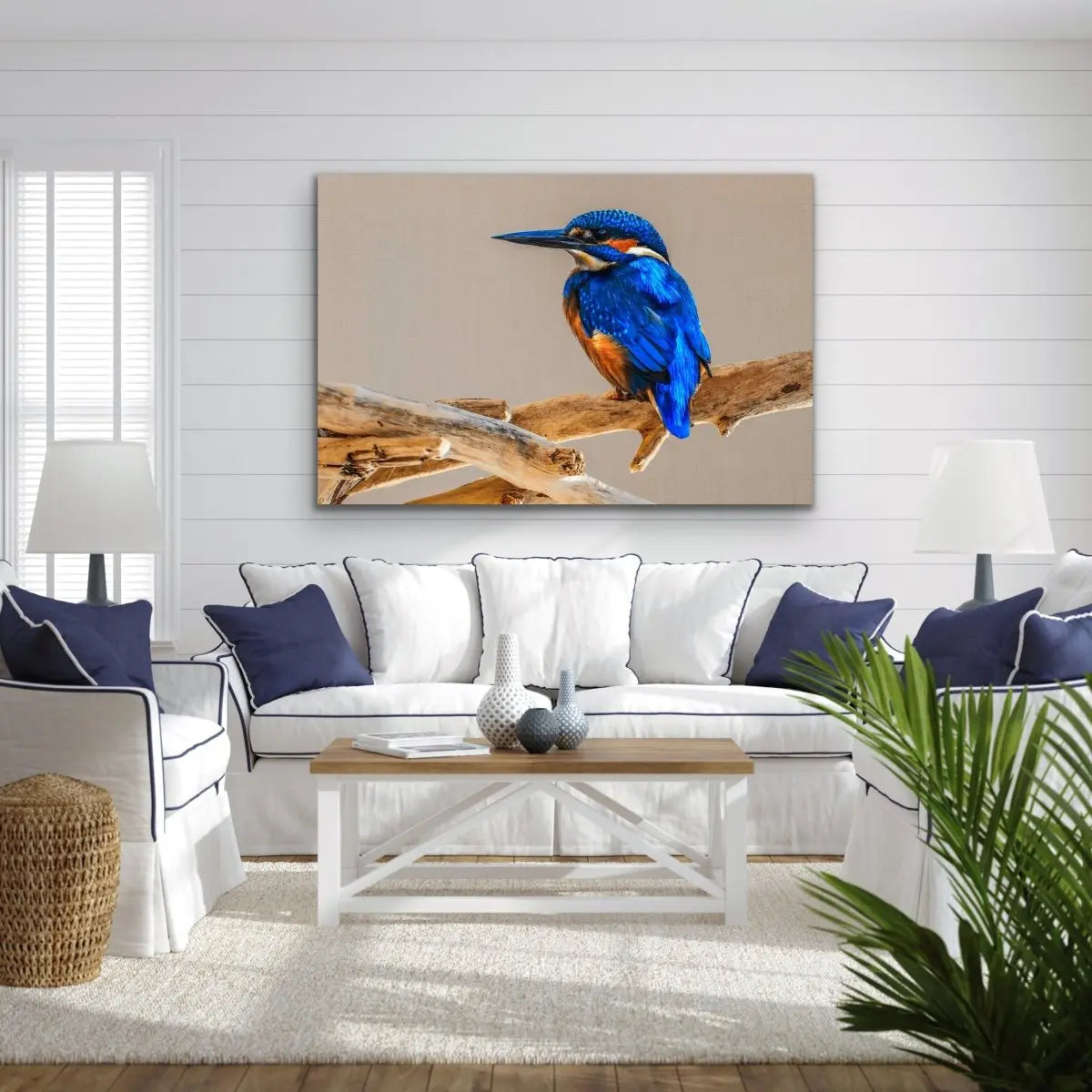 This beautiful, vivid blue Azure Kingfisher is captured in front of a neutral linen background.