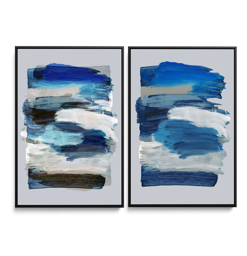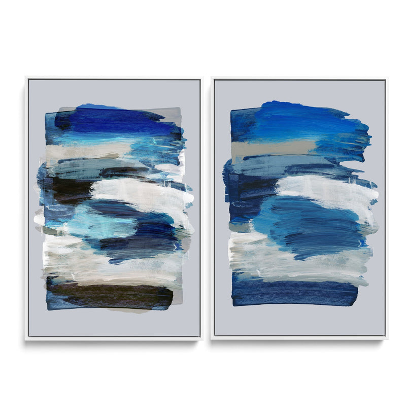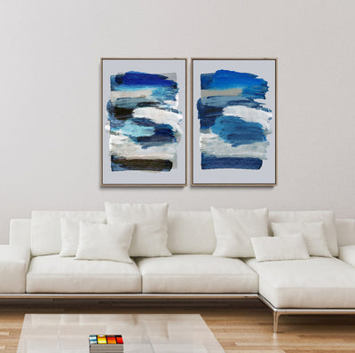 Two gorgeous abstract artworks in shades of blue, white and grey. This set is the perfect way to bring deep ocean shades into your space.