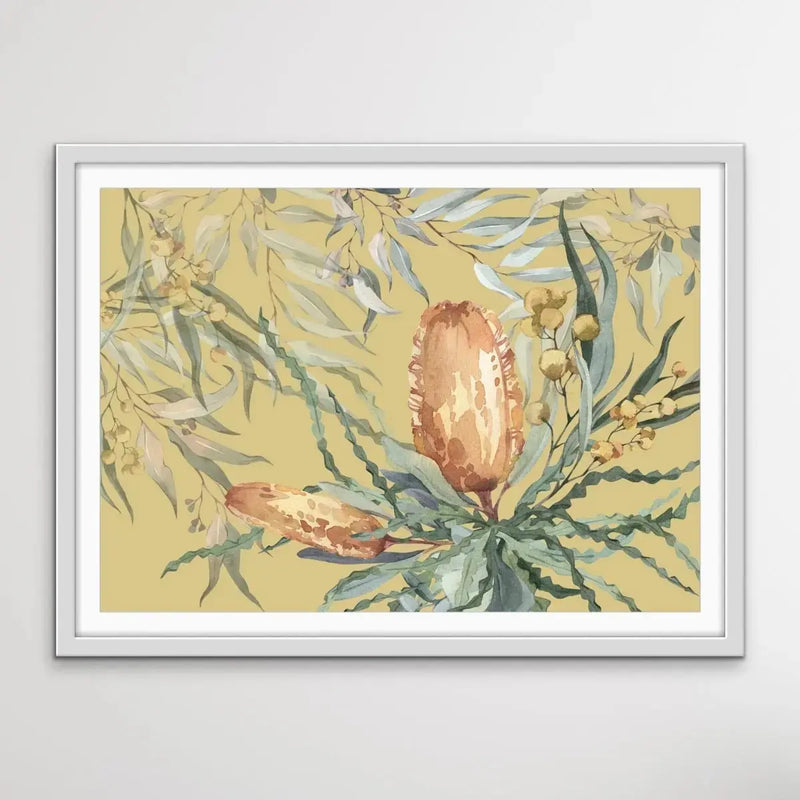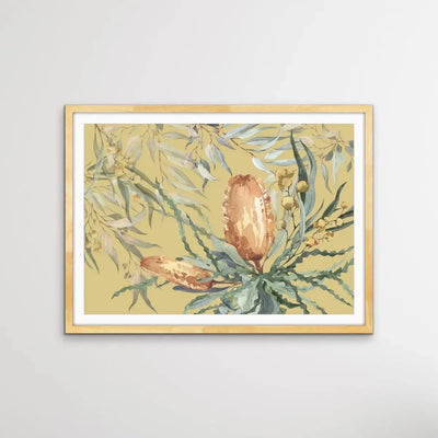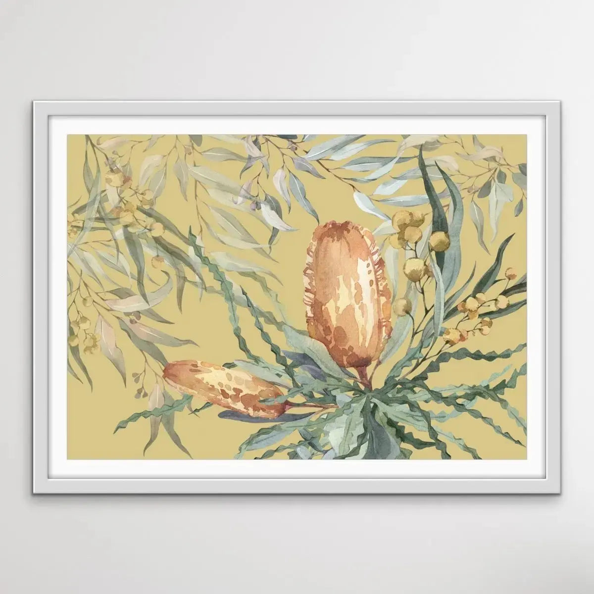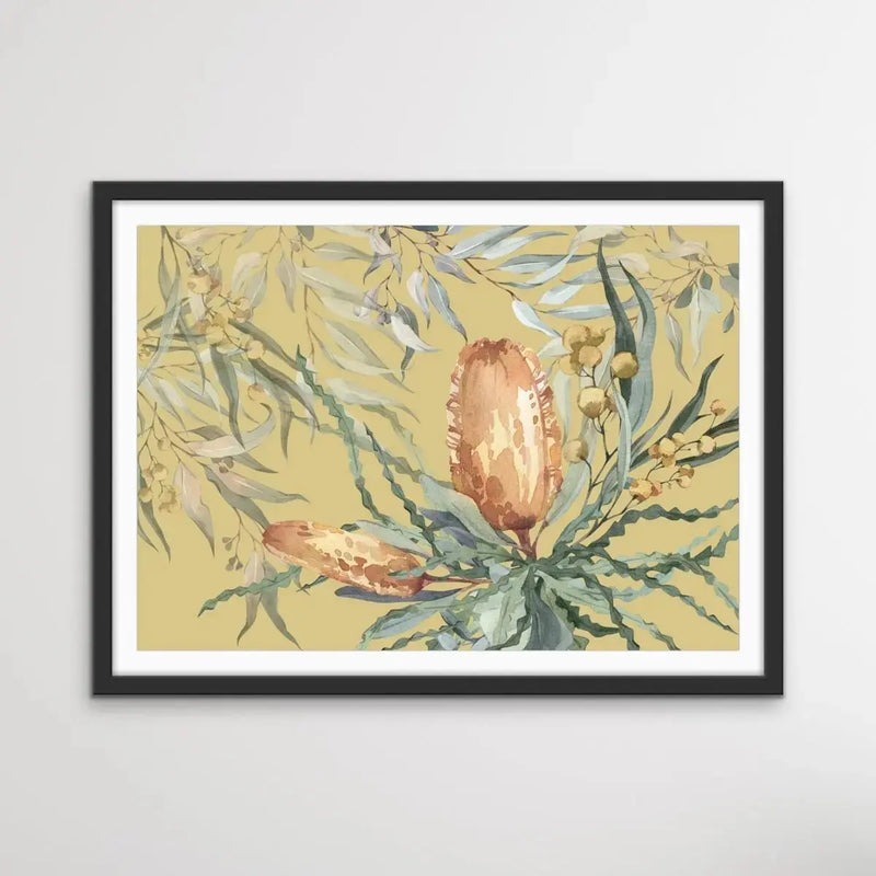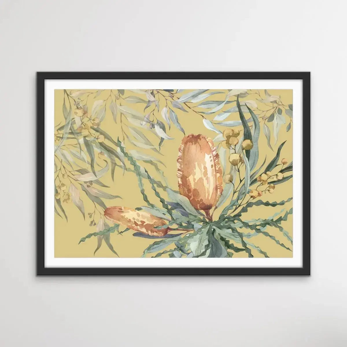 Bush Banksia is a striking original print featuring watercolour illustrations of Australian native plants and flowers against a natural yellow background.