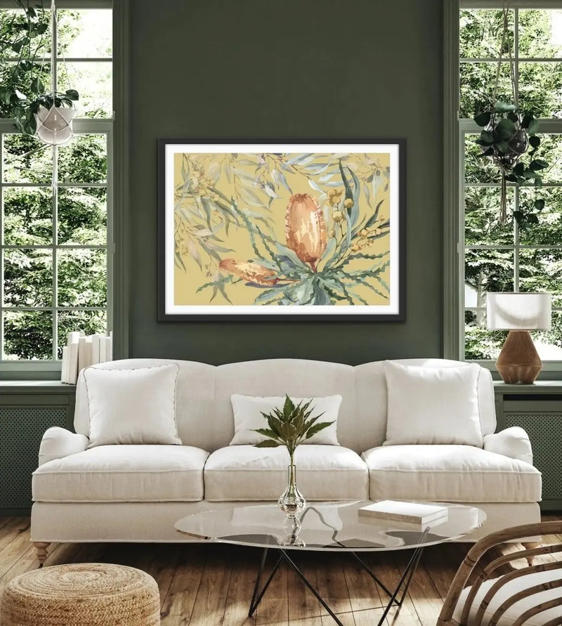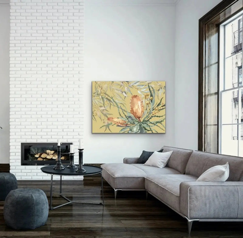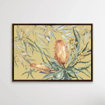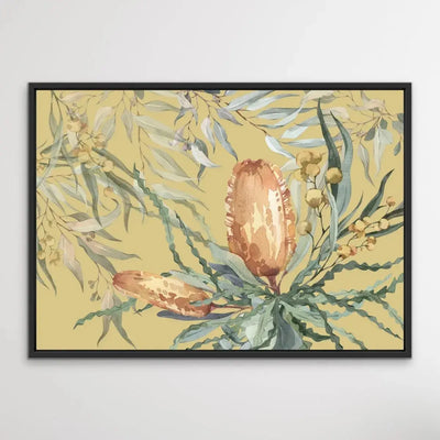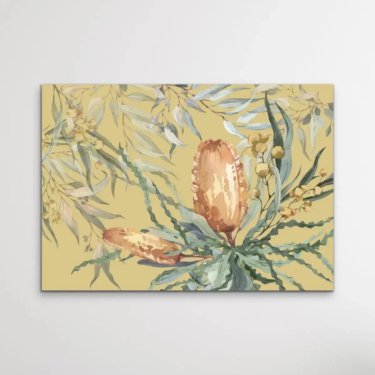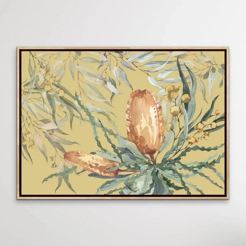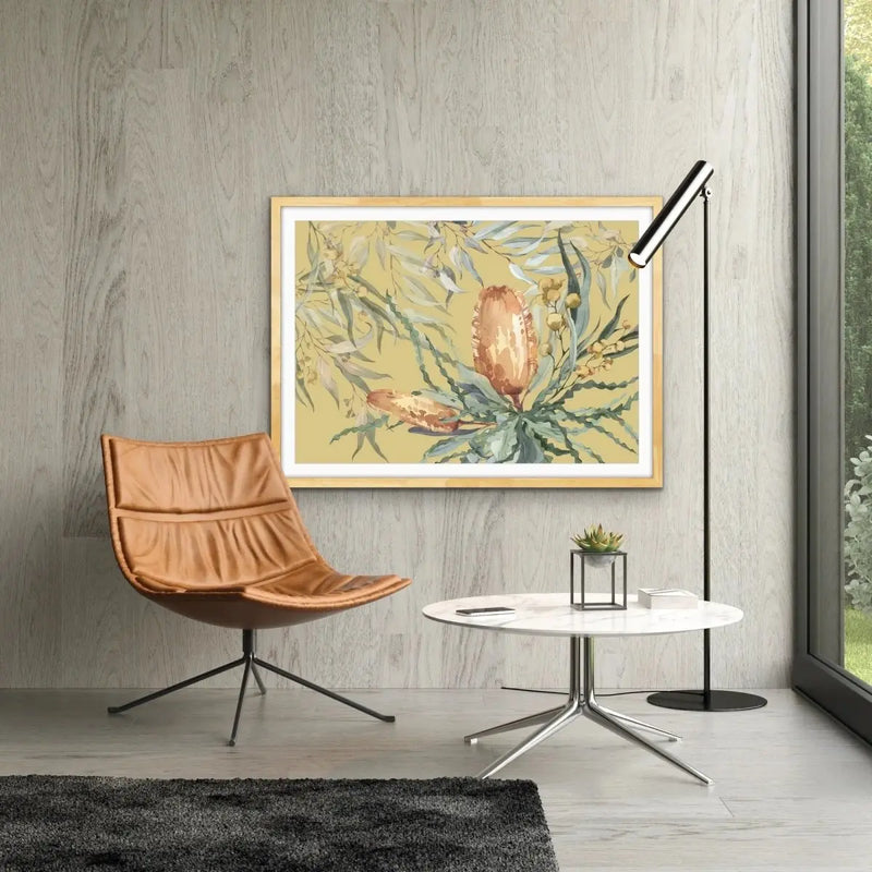 Bush Banksia is a striking original print featuring watercolour illustrations of Australian native plants and flowers against a natural yellow background.