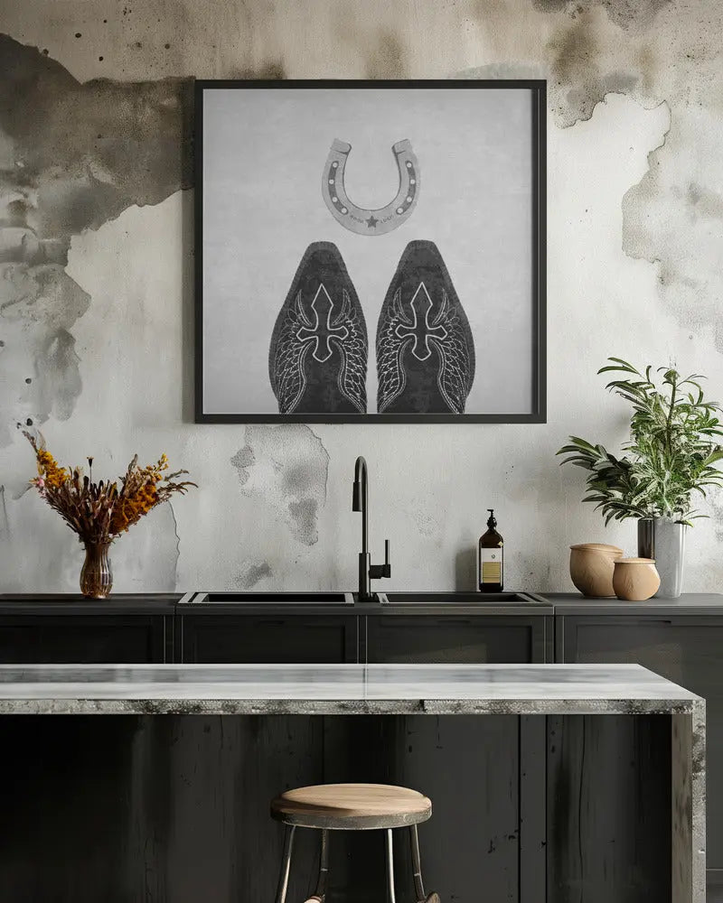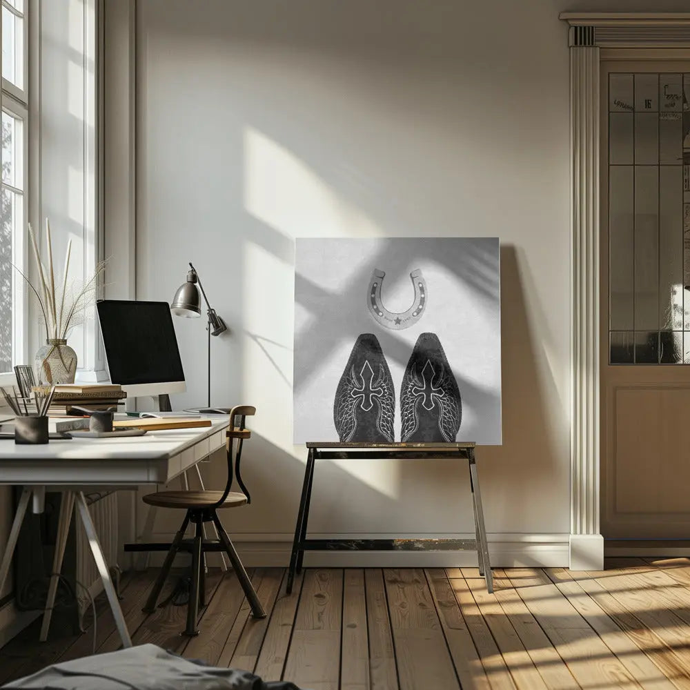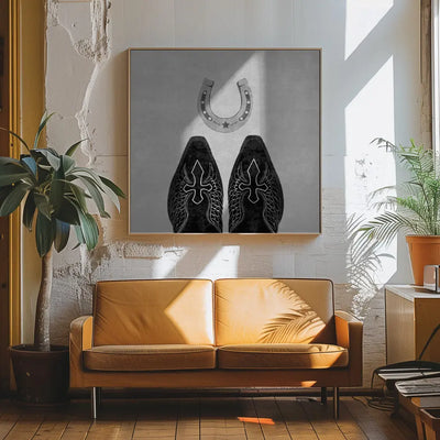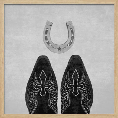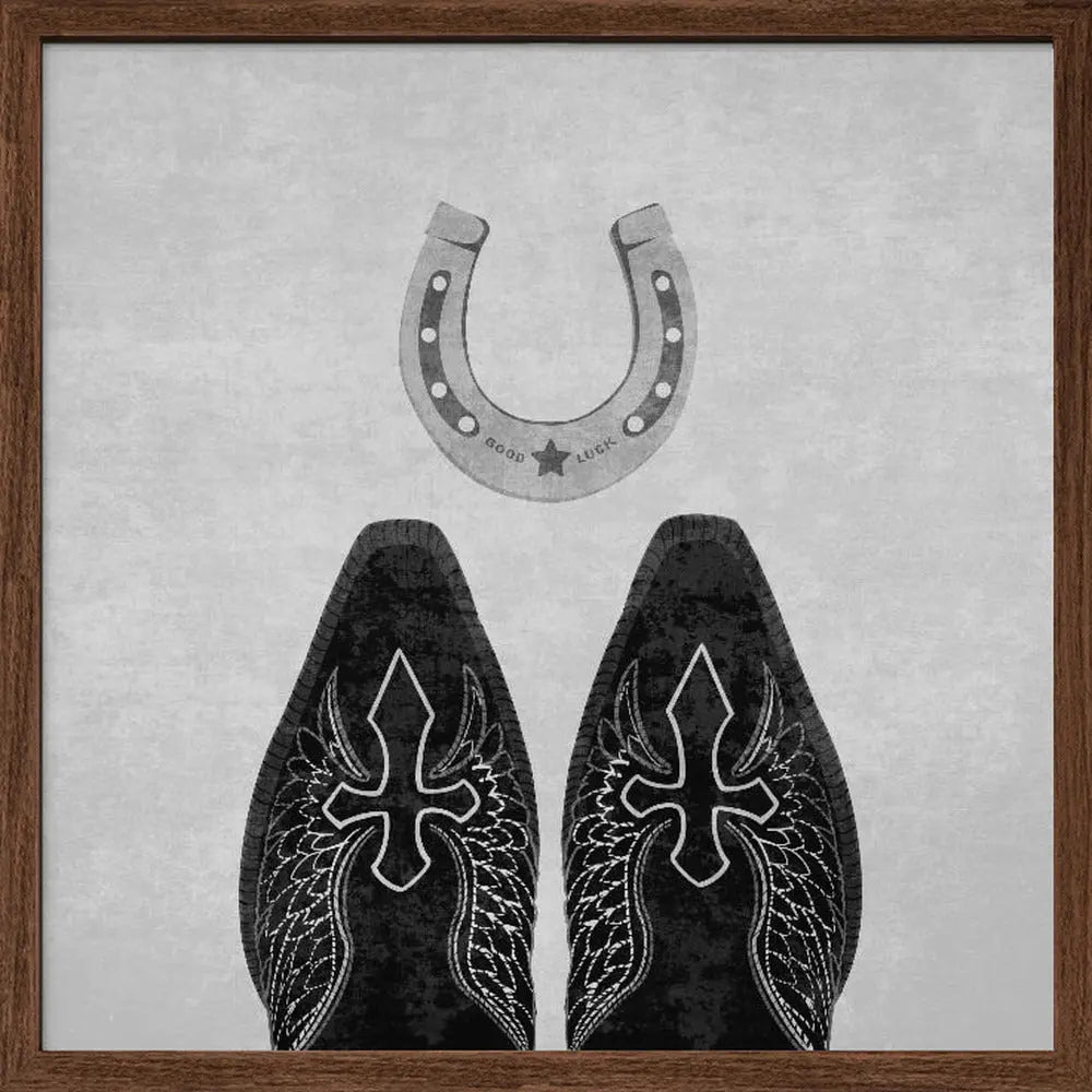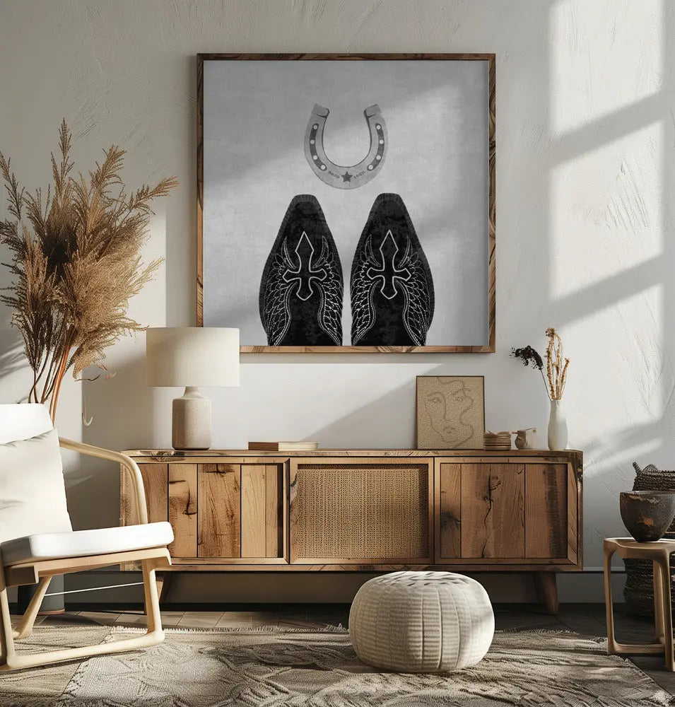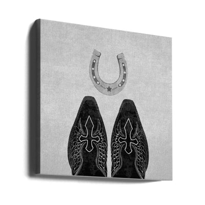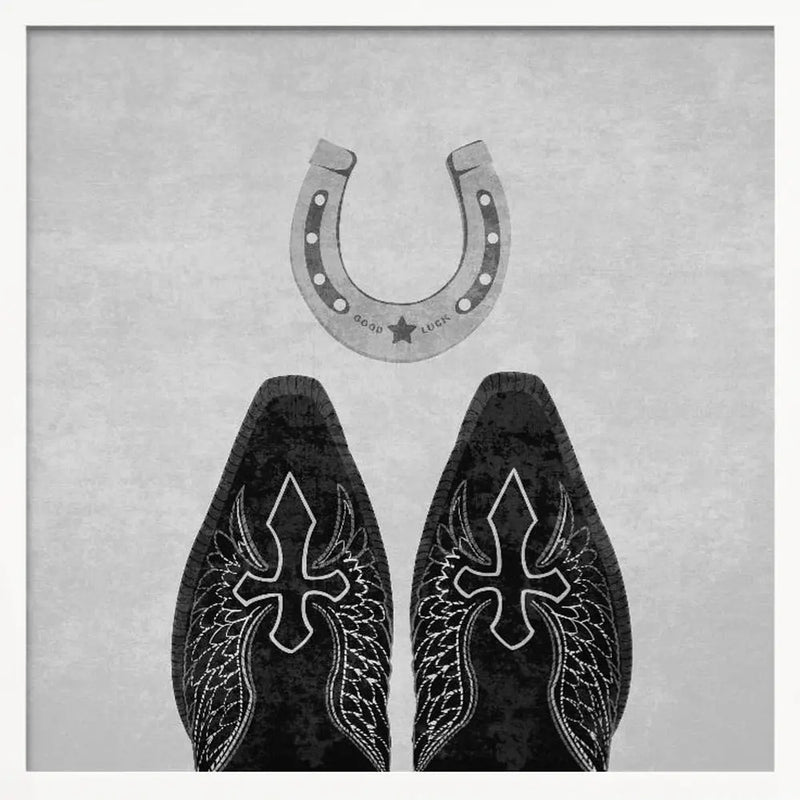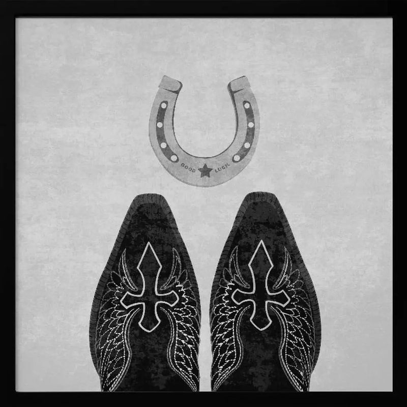 Explore our many print options for Bw Cowboy Boots and Horseshoe by artist Emel Tunaboylu.