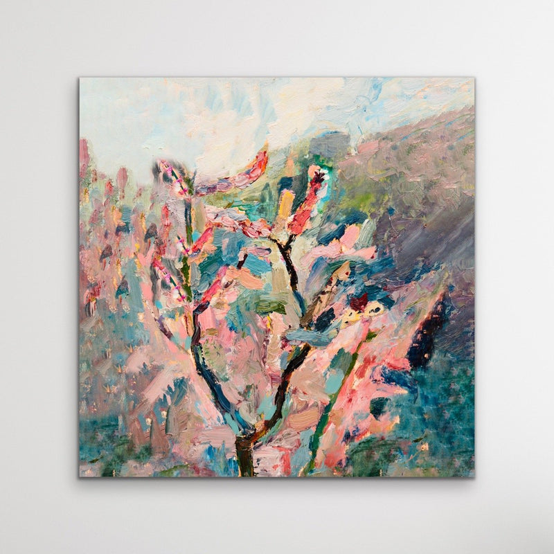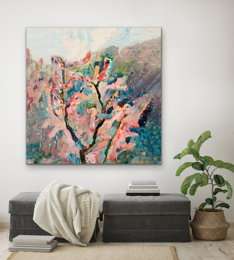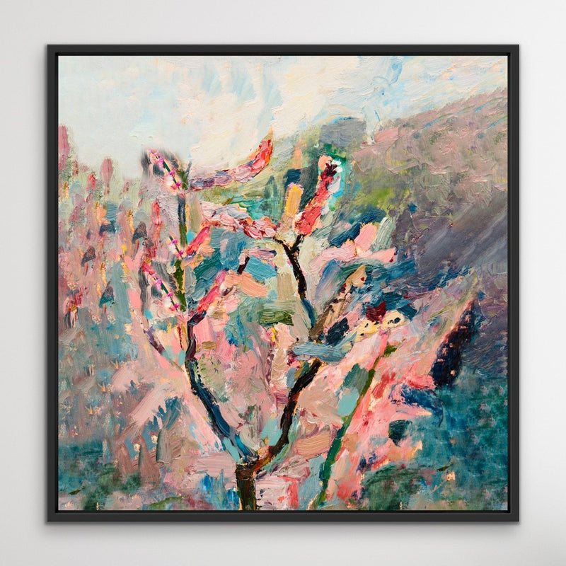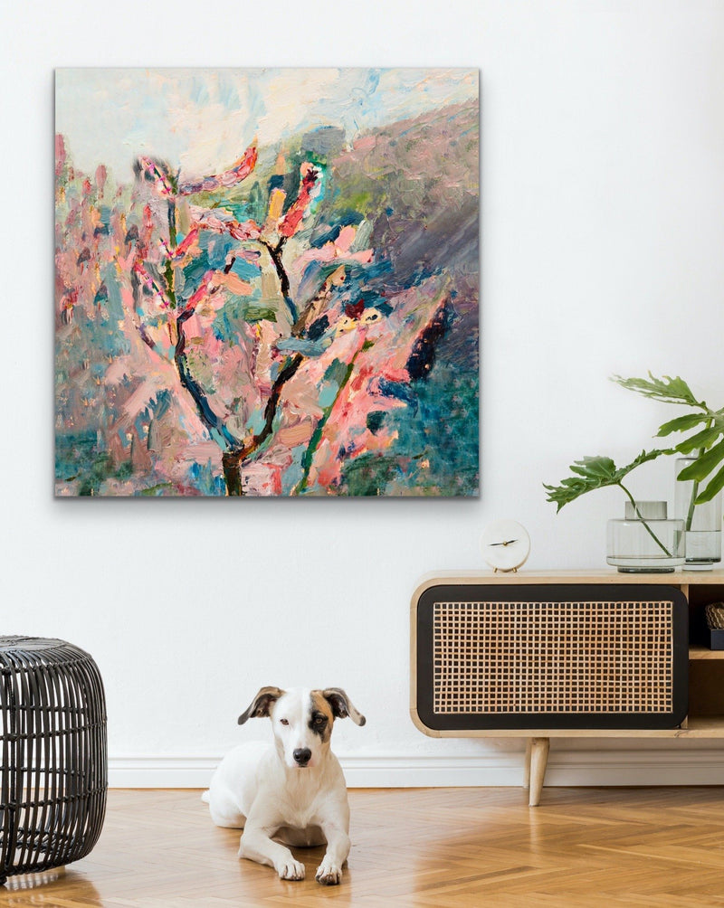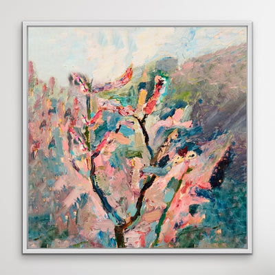 This beautiful canvas print features an abstract rendering of a cherry blossom tree, finished in bold strokes of greens, pinks and a touch of blue.