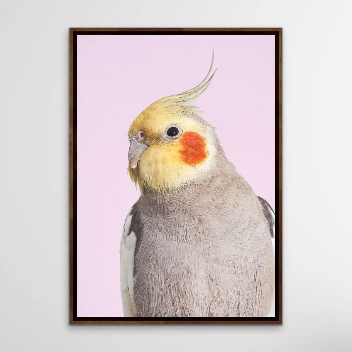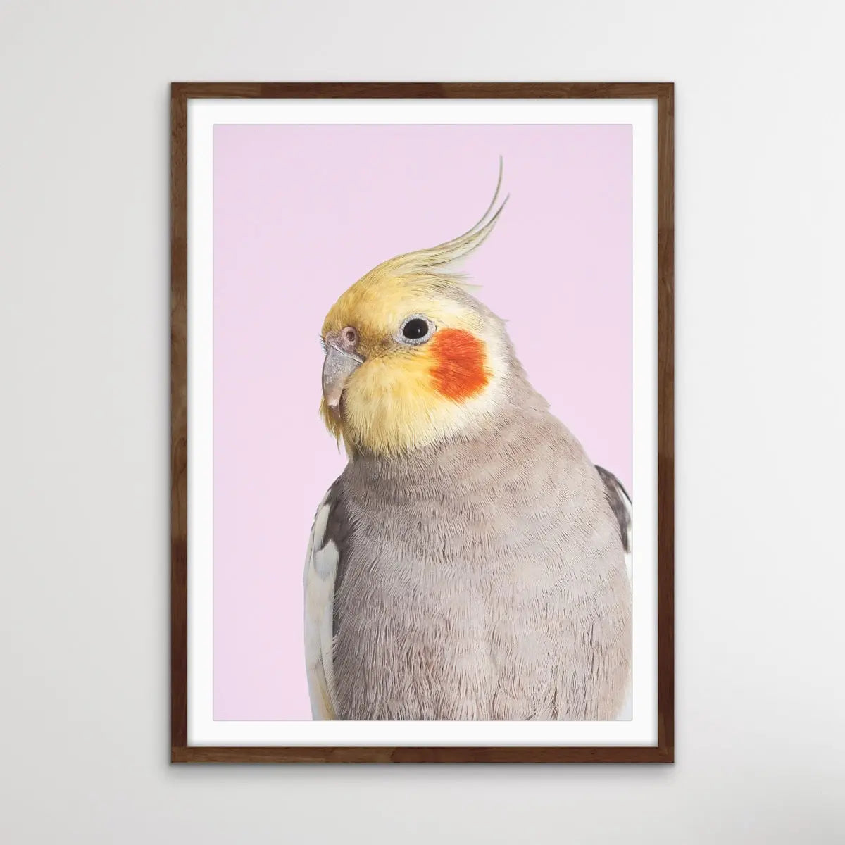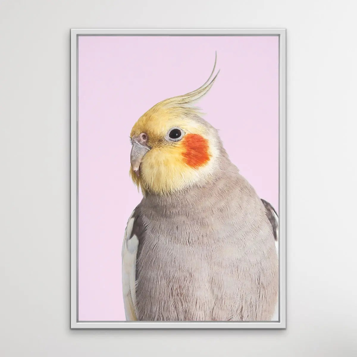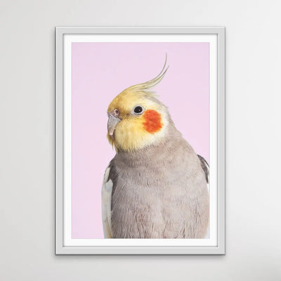 Sweet little cockatiels are a perfect companion bird - and the perfect bird for your walls, too. This sweet print features a cockatoo against a pink backdrop.