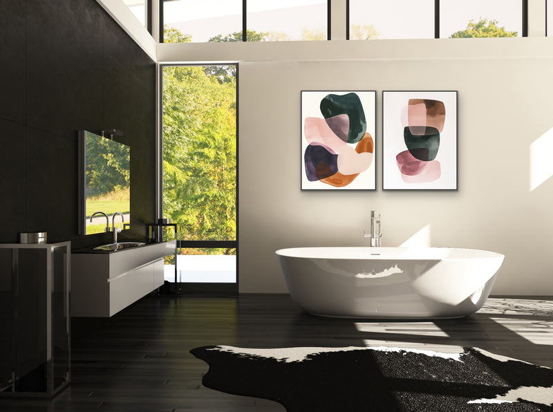 This contemporary geometric print set complements each other perfectly with a colour palette of pinks, oranges and greens.