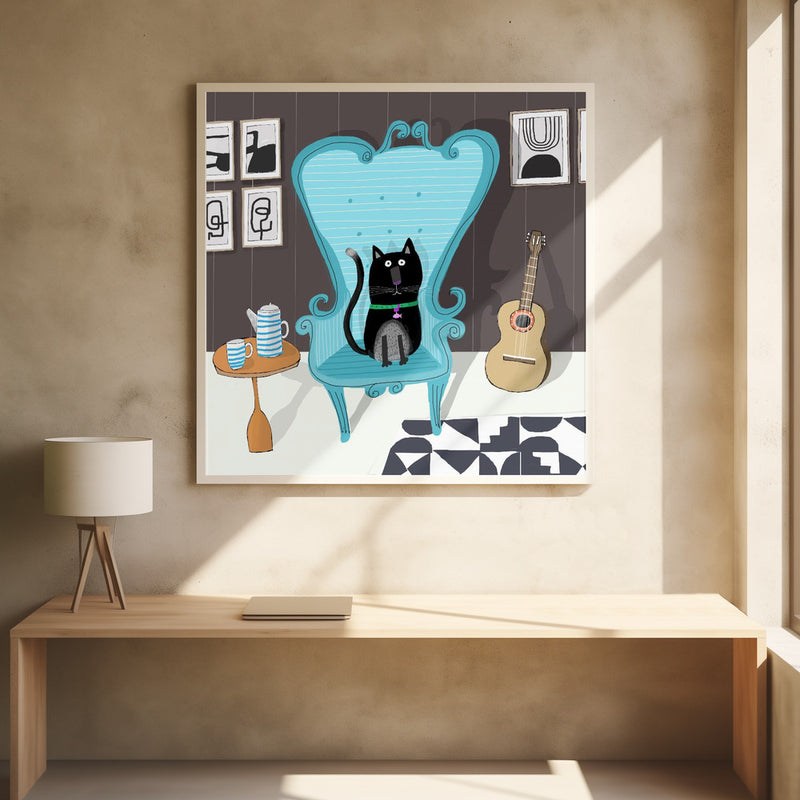 Explore our many print options for Cute Black Cat sitting on Blue Armchair by Artist Carla Daly by artist Carla Daly.