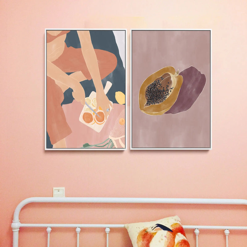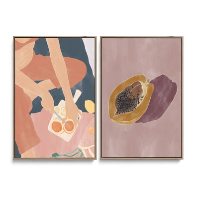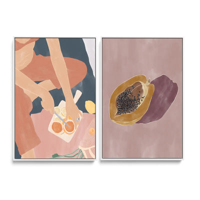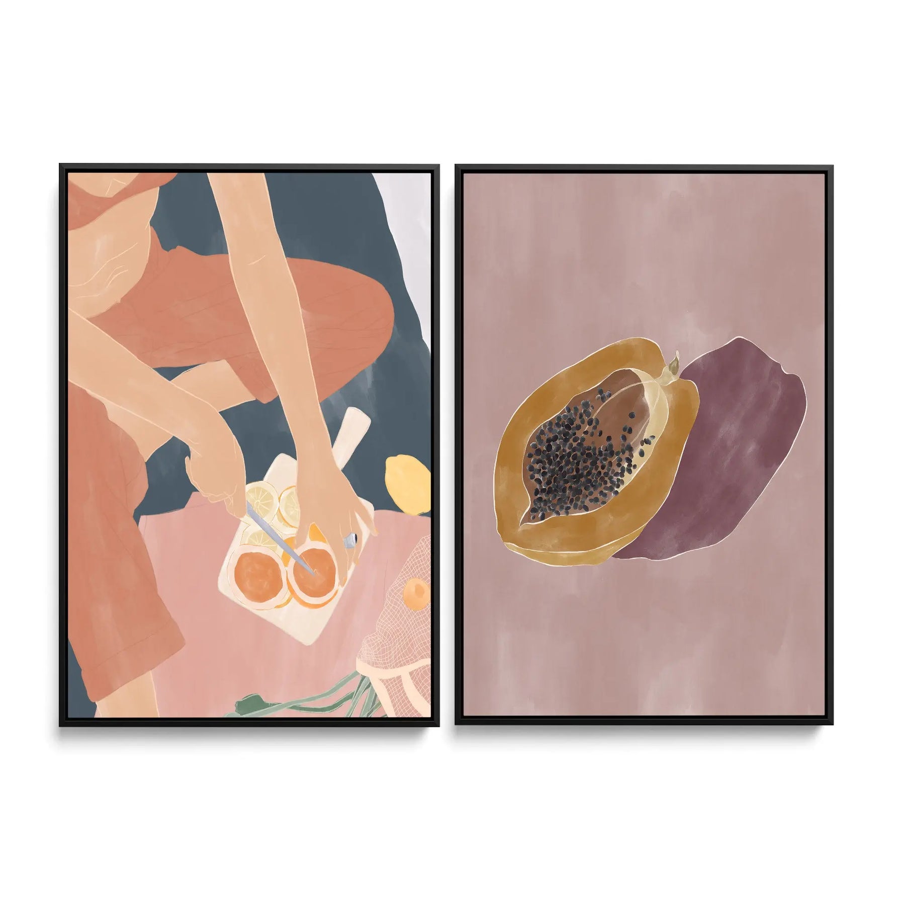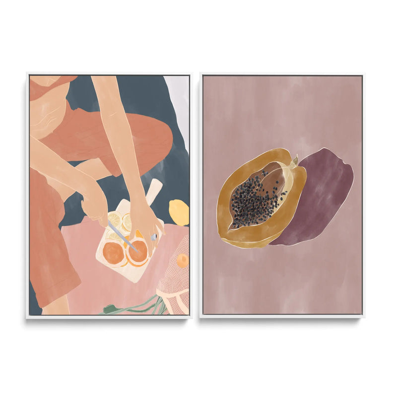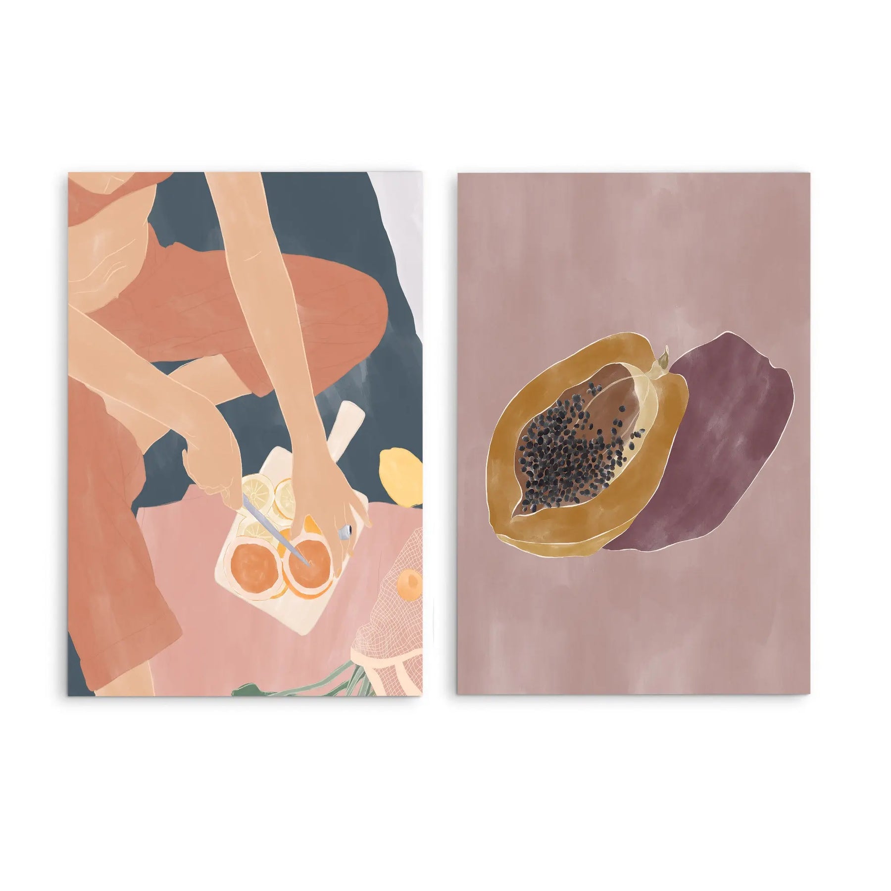 Experience the alluring charm of Ivy Green Illustrations with our Cutting Grapefruits and Papaya art set. Figurative and boho-inspired, these vibrant pieces add a burst of color to any space. Available as a diptych canvas or art print set.