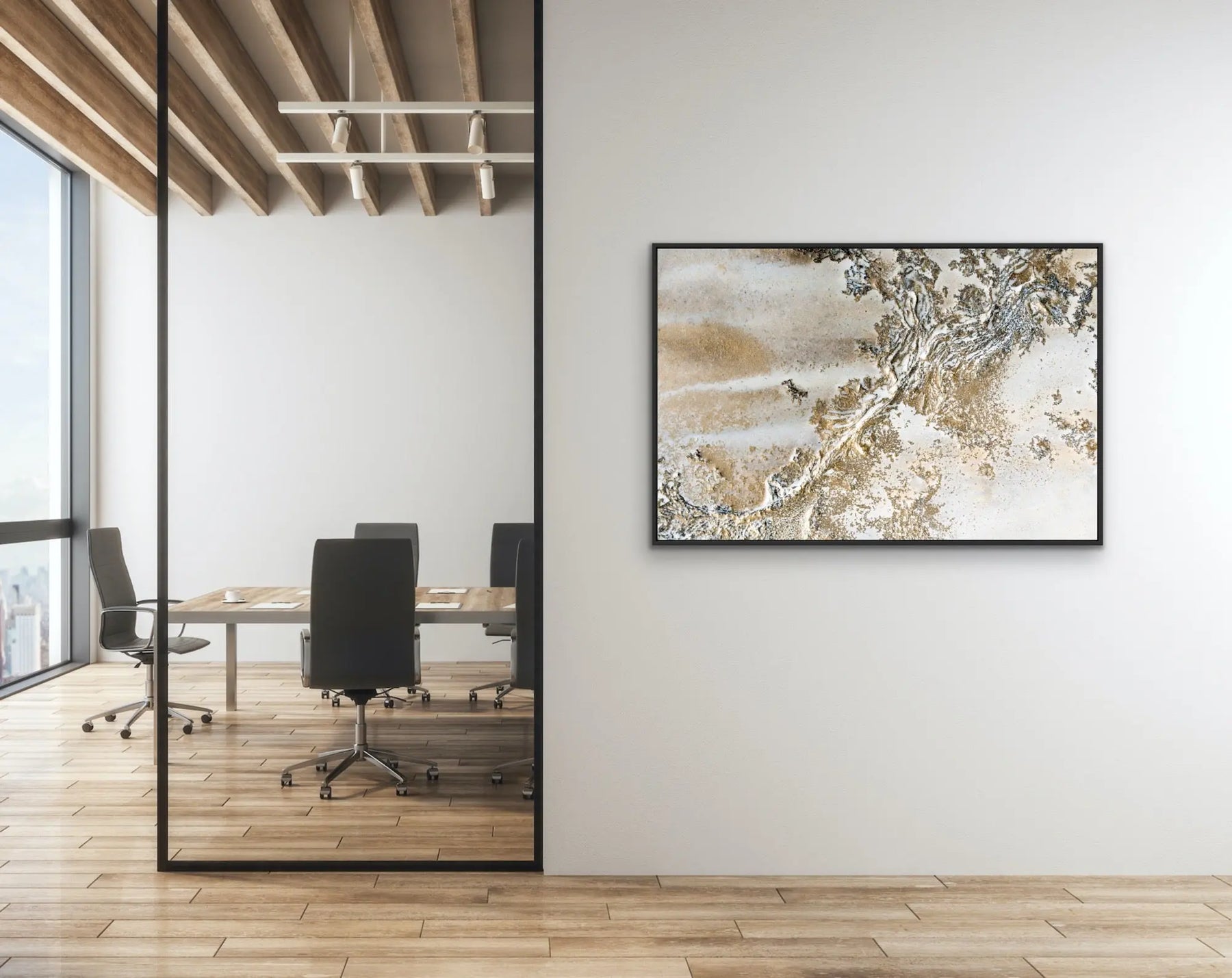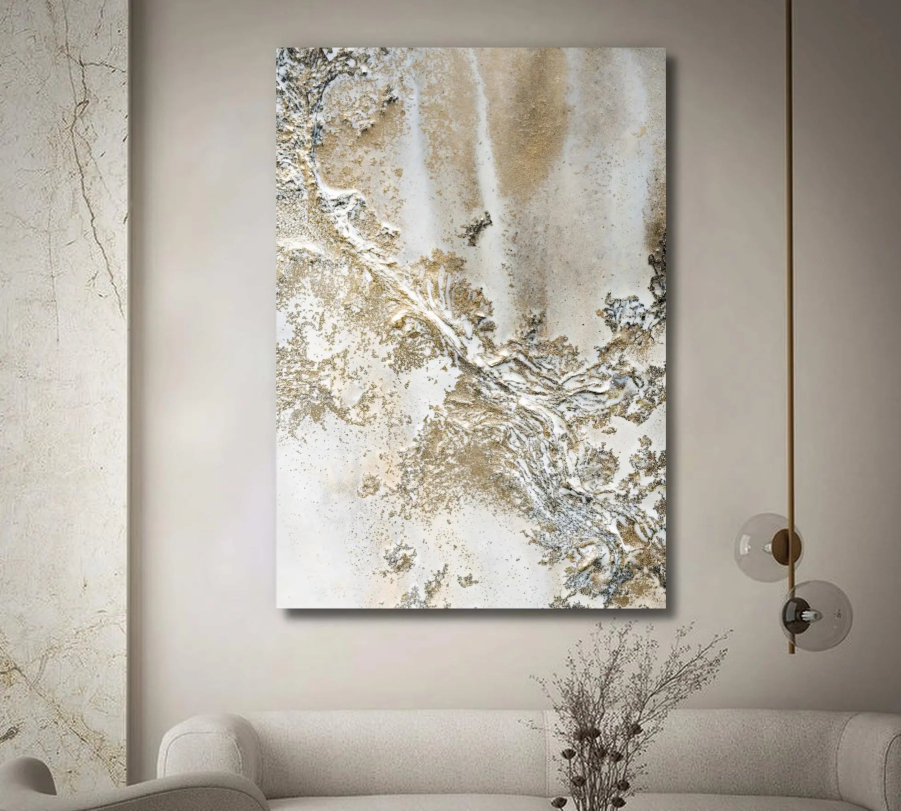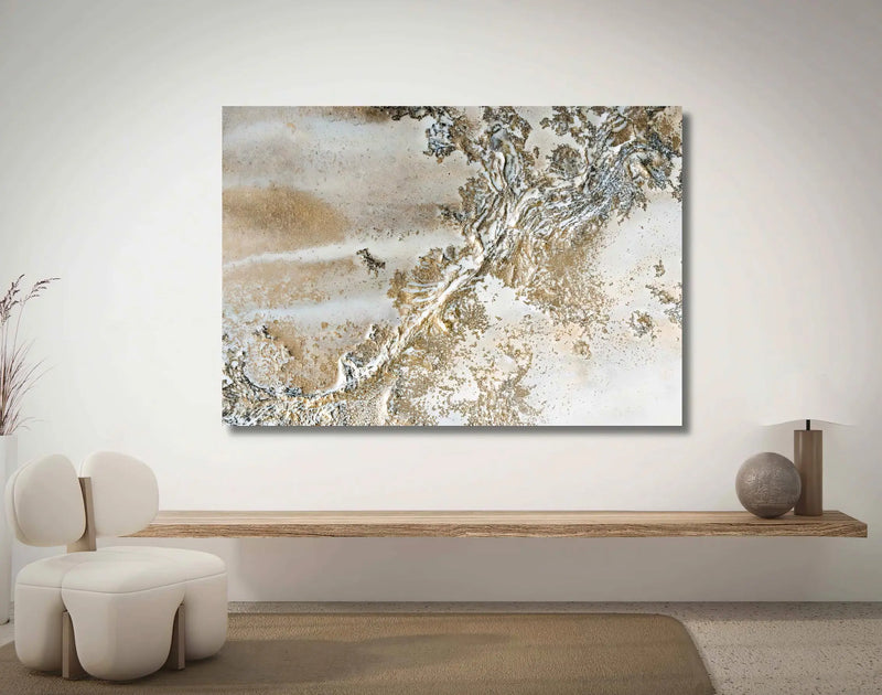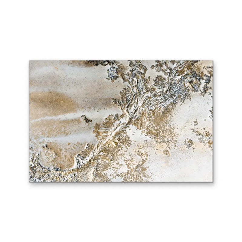 Petra’s creative process is a dynamic interplay of tools and elements: brushes, air guns, spray bottles, gravity, and even a blowtorch mimic the forces of rain, tide, and sun. Layer by layer, she sculpts her paintings, blending materials and harnessing the chemistry of pigments to create mesmerizing, organic compositions.