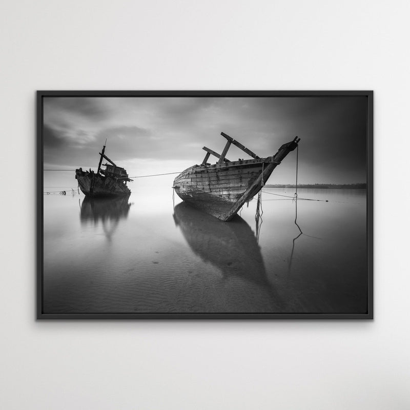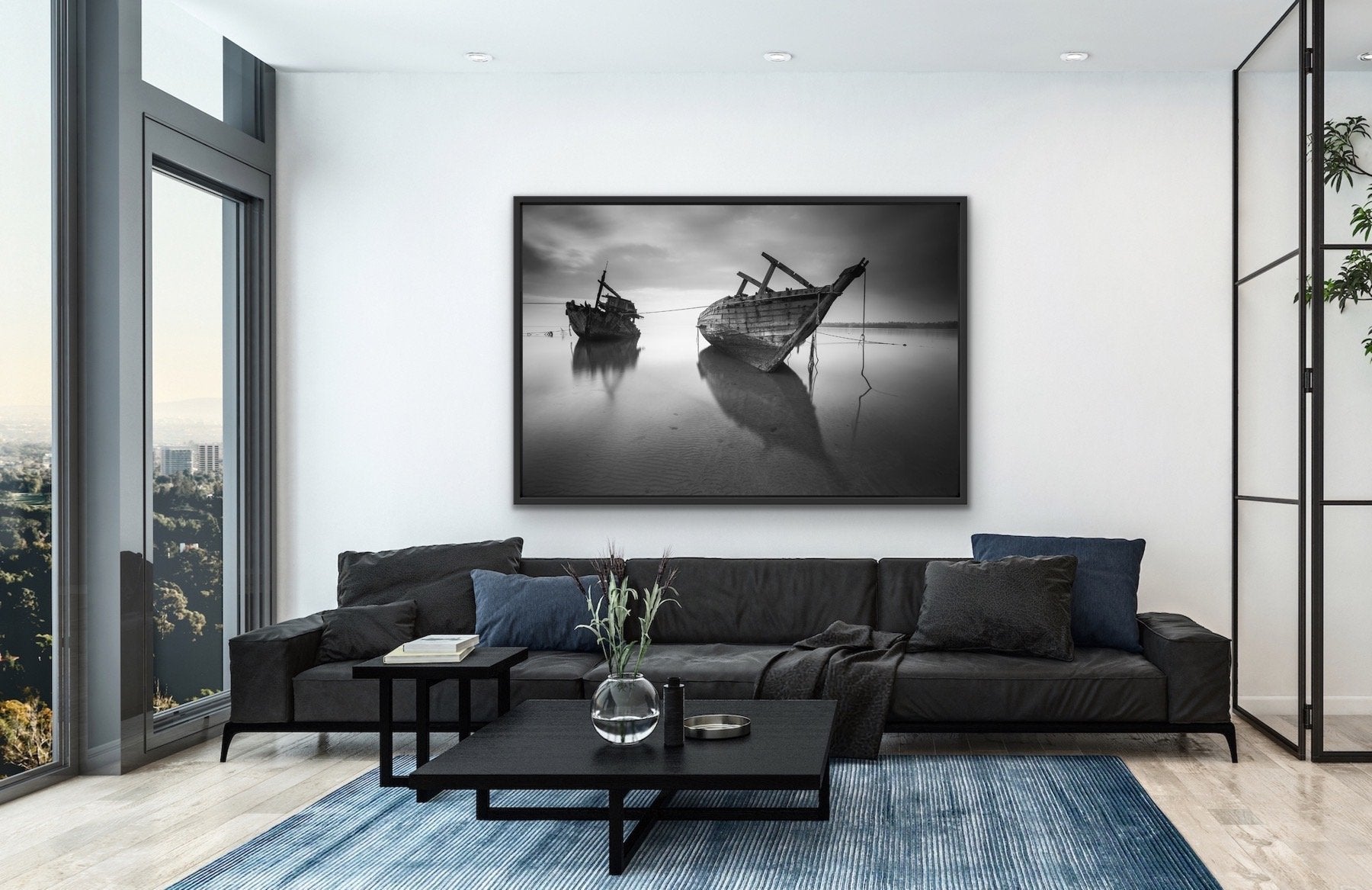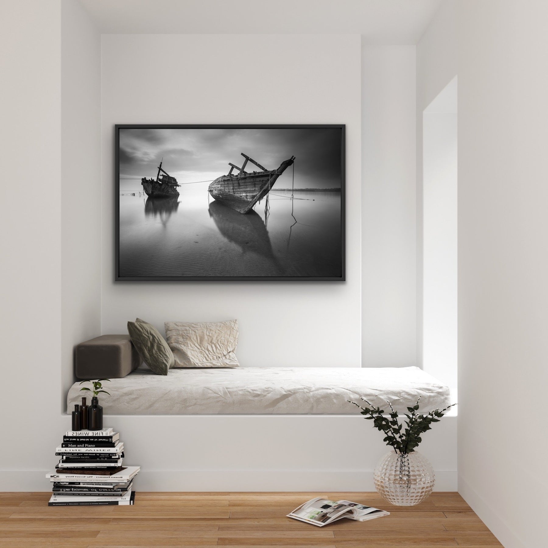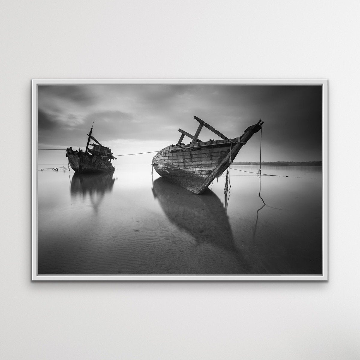 This calm Black and White print features some abandoned boats resting on the shore. Timeless and elegant, this print is perfect for relaxed beach home styling.