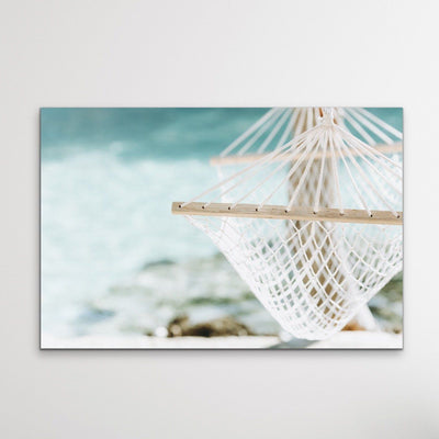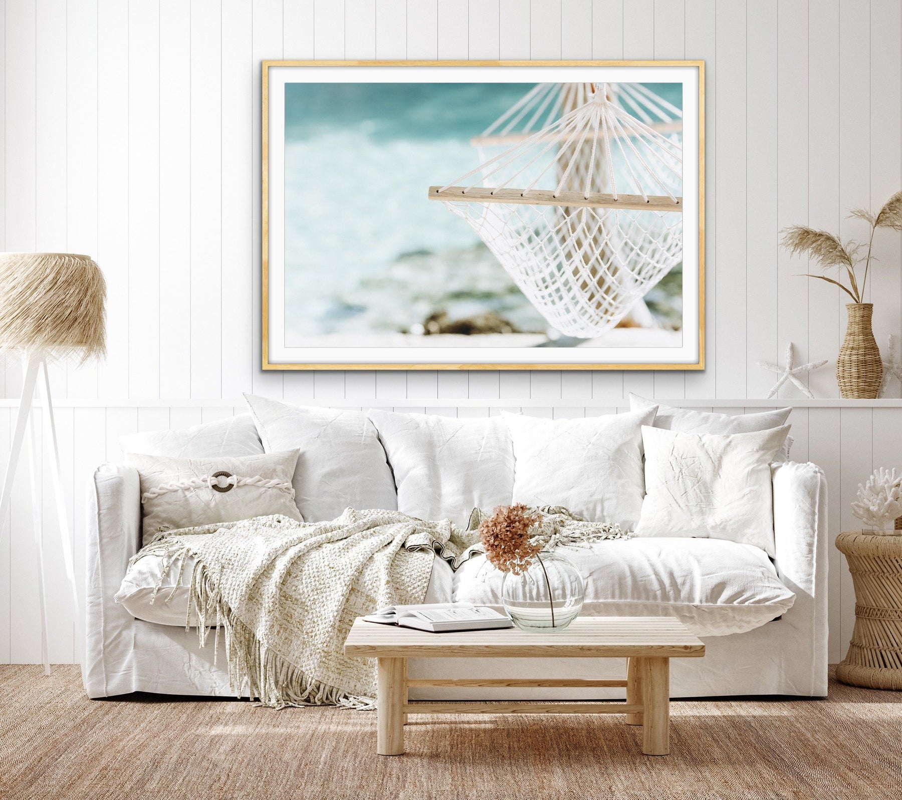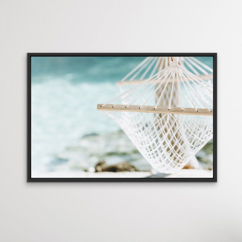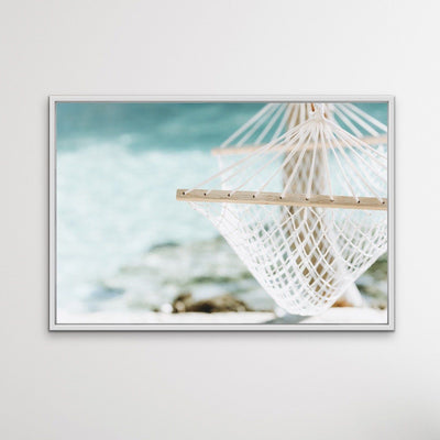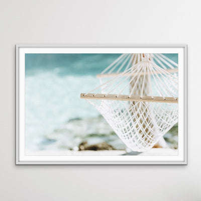 This beautiful photo print features a hammock hanging in front of a pale looking ocean... Inviting and understated, we love this pretty print for beach home styling.