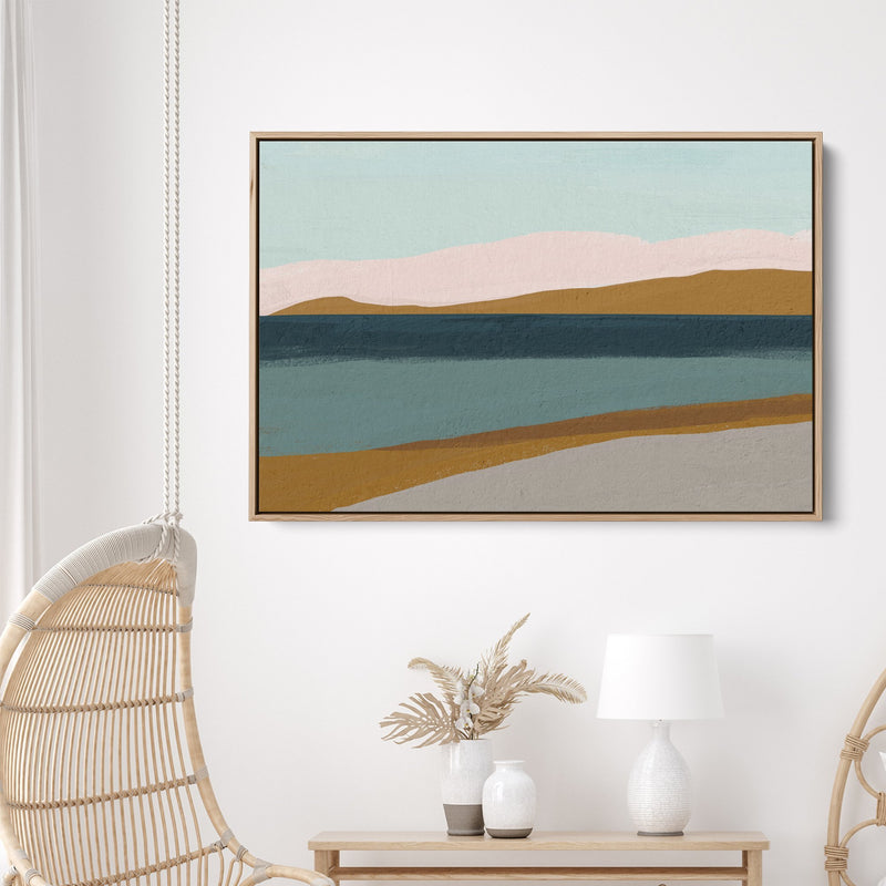 This original landscape print by Fogarty features a beautiful colour palette with ochres, pinks and blues. Perfect as a stretched canvas print, we love this piece in an natural timber frame.