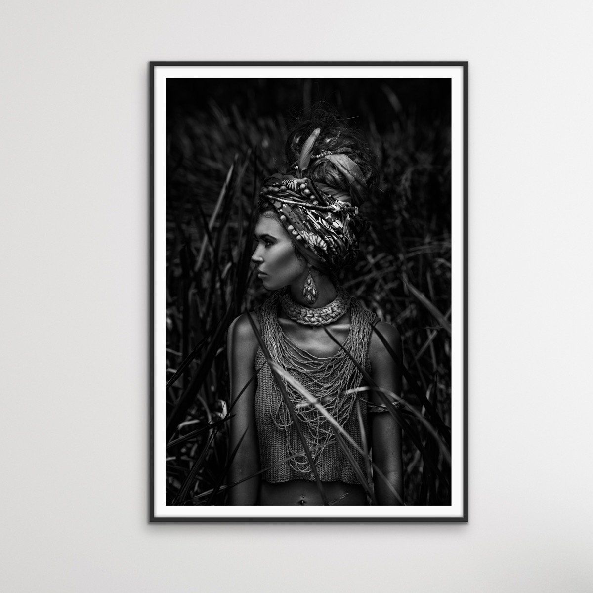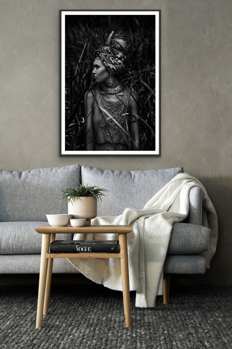This eye-catching black and white photographic print features a striking woman in headdress, perfect for elegant and timeless home styling.