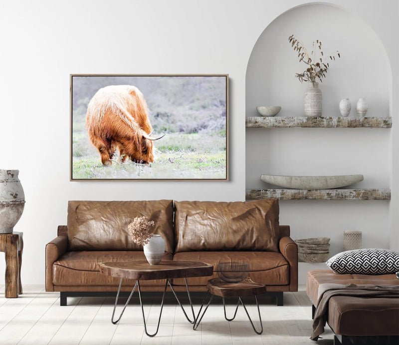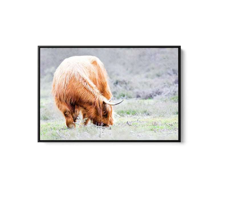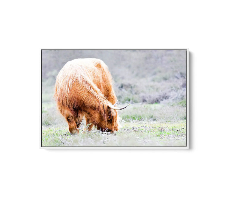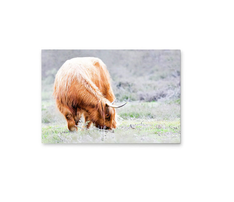 This highland cow is living her best life, munching grass out in in the fields. Her washed out colour-scheme makes this piece a perfect understated styling choice.