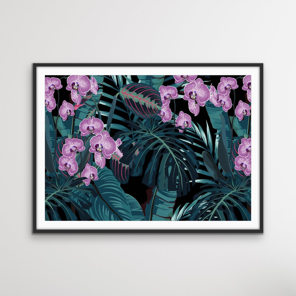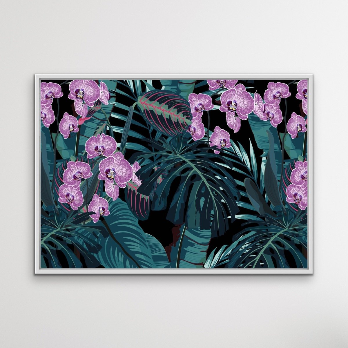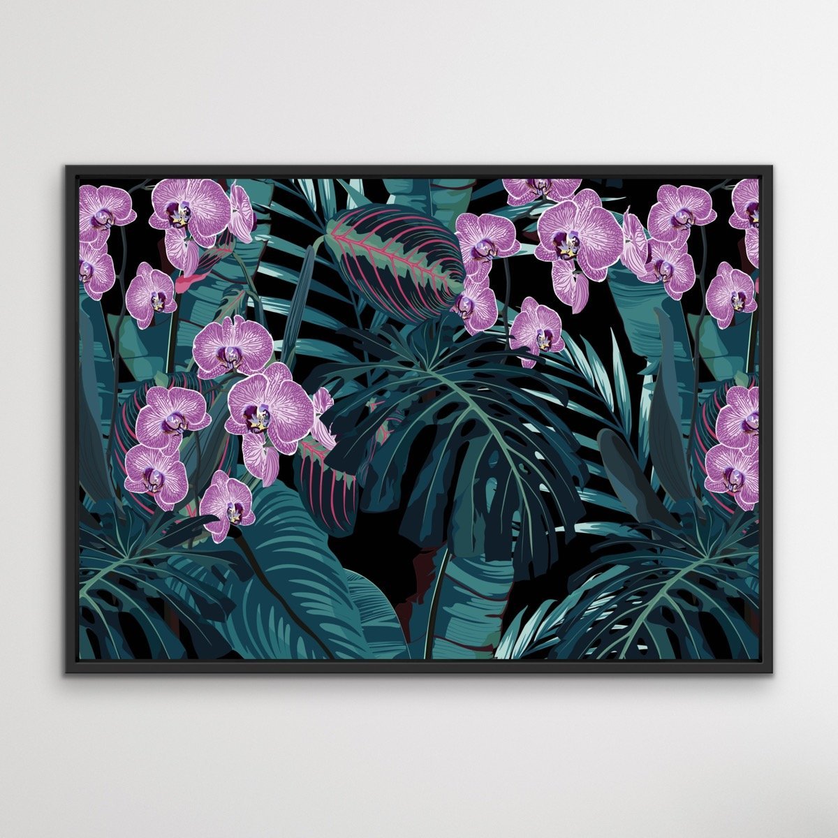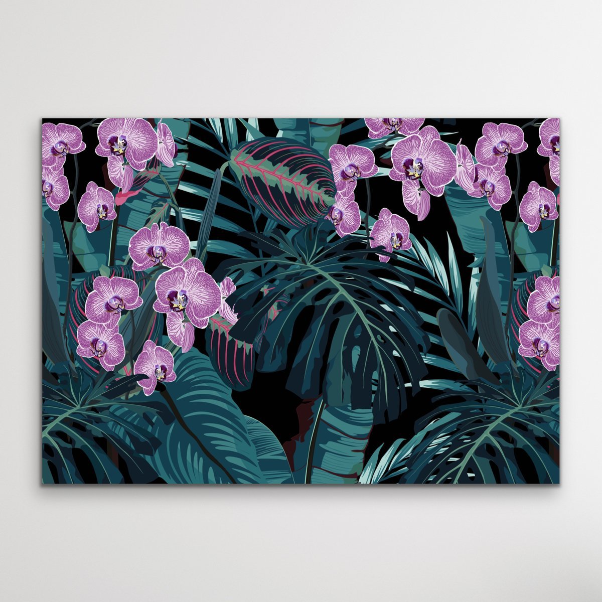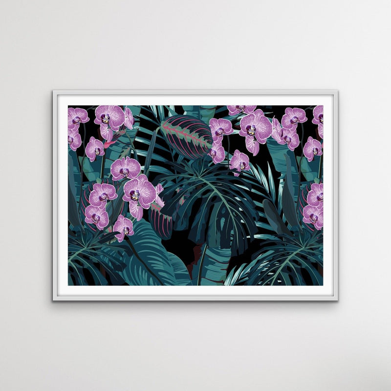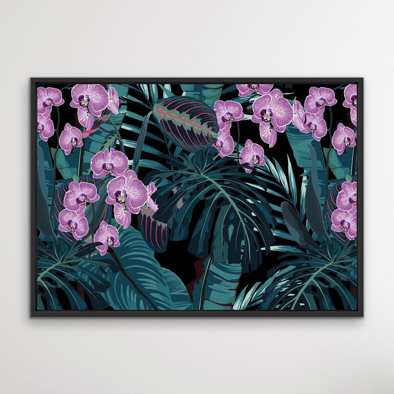 This beautiful canvas or art print features a dark green and purple colour palette, with striking illustrations of jungle leaves and orchids.