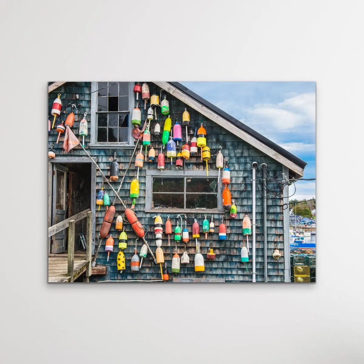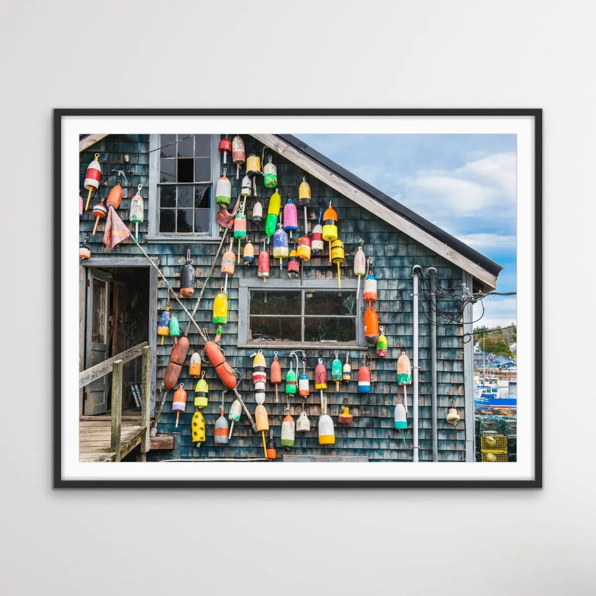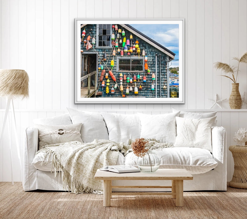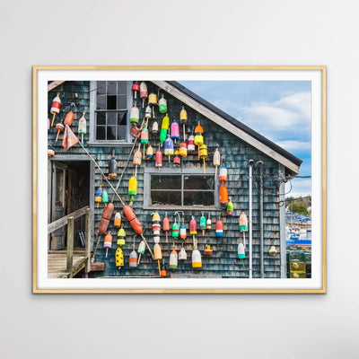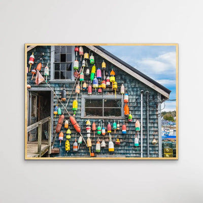 Maine Fishing Shack is a striking and memorable print of a classic Maine USA fishing shack with colourful buoys in place.